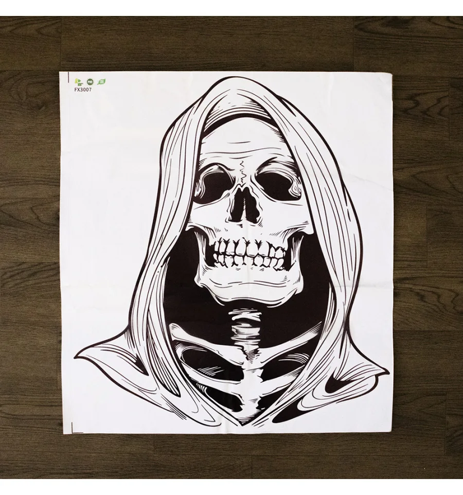 Интерьерная наклейка HL Мрачный Жнец FX3007 60х65см - это быстрый способ классно украсить свой дом. Интернет - магазин PrazdnikShop предлагает Вам купить интерьерные наклейки хоррор тематики, которые идеально подойдут на кухню, спальню, гостиную, детскую или игровую комнату. Украшение на стену оценят в комнате страха или декора хэллоуин. Как 3D наклейка клеится на стену ? Способ поклейки очень прост. Для начала необходимо очистить поверхность, на которую необходимо наклеить. После снимаем пленку и переносим рисунок на стену или другую плоскость рукой или ветошью. На какие поверхности можно клеить интерьерную наклейку ? Поклейка возможна на любую ИДЕАЛЬНО ГЛАДКУЮ ГЛЯНЦЕВУЮ поверхность, например : стена окрашенная глянцевой краской без каких-либо рельефов ( в краске не должно быть мелового компонента), стекло, зеркало, лакированные поверхности, гладкий пластик. На обои клеить НЕЛЬЗЯ. Ухаживать за стикерами на стену также достаточно легко, для этого необходимо лишь иногда протирать их влажной губкой или тряпкой. Яркость и насыщенность наклеек не меняется с течением времени, кроме того они абсолютно устойчивы к влажности.