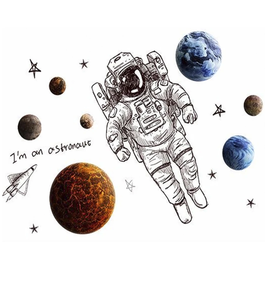 Интерьерная наклейка SS Космонавт XL8335 90х60см - это быстрый способ классно украсить свой дом. Интернет-магазин PrazdnikShop предлагает Вам купить интерьерные наклейки на тематику космос, которые идеально подойдут на кухню, спальню, гостиную, детскую или игровую комнату. Украшение на стену оценят дети в своих спальнях или игровых комнатах. Интерьерная наклейка Космонавт XL8335 90х60см с принтом астронавта и планет. Размер листа с наклейками: 60х90 см. Размер астронавта - 75х48, 5 см. Диаметр планет от 8 до 30 см. Как 3D наклейка клеится на стену ? Способ поклейки очень прост. Для начала необходимо очистить поверхность, на которую необходимо наклеить. После снимаем пленку и переносим рисунок на стену или другую плоскость рукой или ветошью. На какие поверхности можно клеить интерьерную наклейку ? Поклейка возможна на любую ИДЕАЛЬНО ГЛАДКУЮ ГЛЯНЦЕВУЮ поверхность, например : стена окрашенная глянцевой краской без каких-либо рельефов ( в краске не должно быть мелового компонента), стекло, зеркало, лакированные поверхности, гладкий пластик. На обои клеить НЕЛЬЗЯ. Ухаживать за стикерами на стену также достаточно легко, для этого необходимо лишь иногда протирать их влажной губкой или тряпкой. Яркость и насыщенность наклеек не меняется с течением времени, кроме того они абсолютно устойчивы к влажности.