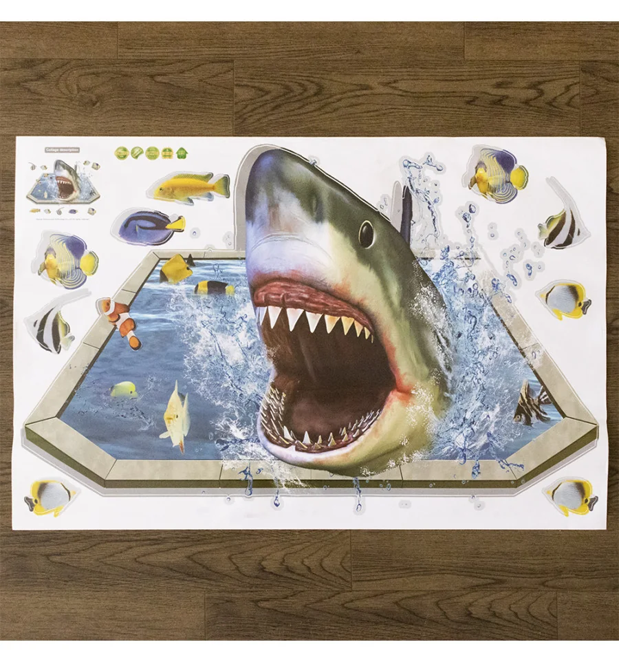 Интерьерная наклейка ZOO Акула SK9023 90х60см - это быстрый способ классно украсить свой дом. Интернет-магазин PrazdnikShop предлагает Вам купить интерьерные наклейки на морскую тематику, которые идеально подойдут на кухню, спальню, гостиную, детскую или игровую комнату. Украшение на стену оценят дети в своих спальнях или игровых комнатах. Как 3D наклейка клеится на стену ? Способ поклейки очень прост. Для начала необходимо очистить поверхность, на которую необходимо наклеить. После снимаем пленку и переносим рисунок на стену или другую плоскость рукой или ветошью. На какие поверхности можно клеить интерьерную наклейку ? Поклейка возможна на любую ИДЕАЛЬНО ГЛАДКУЮ ГЛЯНЦЕВУЮ поверхность, например : стена окрашенная глянцевой краской без каких-либо рельефов ( в краске не должно быть мелового компонента), стекло, зеркало, лакированные поверхности, гладкий пластик. На обои клеить НЕЛЬЗЯ. Ухаживать за стикерами на стену также достаточно легко, для этого необходимо лишь иногда протирать их влажной губкой или тряпкой. Яркость и насыщенность наклеек не меняется с течением времени, кроме того они абсолютно устойчивы к влажности.