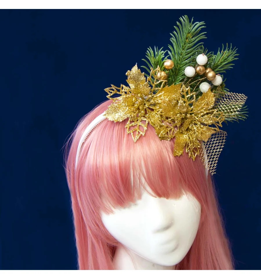 Интернет магазин PrazdnikShop предлагает Вам купить оптом по-настоящему зимний и стильный обруч с веточками ели и декоративными цветами, полностью ручной работы. Очаровательный рождественский ободок – нарядный аксессуар для фотосессии, корпоратива, создания уникального образа или любого другого торжества. Золотые декоративные цветы пуансетии с литыми веточками ели смотрятся просто великолепно и очень празднично, а также создают праздничное настроение и идеально впишутся в новогодние торжества. Композиция надежно закреплена на пластиковом белом ободке универсального размера, украшенном белой репсовой лентой. Это новогоднее украшение на голову сделает Ваш наряд на любой праздничной вечеринке и будет изюминкой образа, как вишенка на торте.
