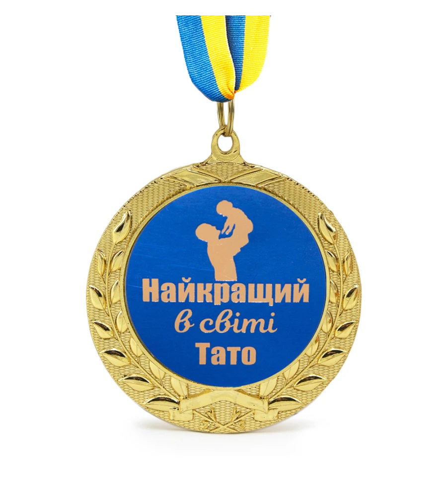 Медаль подарочная 43323Т Найкращий в світі тато - прекрасный презент для отца на день рождения, Новый год или просто так, без повода, потому что ваш папа – самый лучший. Золотые буквы на матовом синем фоне с силуэтом отца, который держит на руках ребенка. Лавровый венок золотистого оттенка довершает картину. Не знаете, что подарить отцу? Выбирайте подарок на нашем сайте. Оригинальные подарки, такие как эта отцовская медаль, призваны дарить хорошее настроение и останутся на долгую и добрую память. Медаль подарочная в золотом обрамлении лавровых листьев - произведет впечатление и несомненно станет отличным подарком на память! Медаль выполнена из сплавов различных металлов с покрытием благородного золотистого цвета нанесенного булатным способом, диаметром 7 см, с жетоном диаметром 5см и желто-голубой репсовой лентой длиною 40см. Медаль не подходит для выполнения на ней гравировки. Наш магазин предлагает товары оптом и для дропшипперов, вы можете оформить заказ на сайте PrazdnikShop и задать любые интересующие вопросы менеджеру, заказав звонок на нашем сайте. А если вы еще презентуете вашей маме медаль Найкраща матуся, которую также можно найти на нашем сайте, есть шанс дать начало веселой традиции - на все семейные праздники надевать родительские награды.