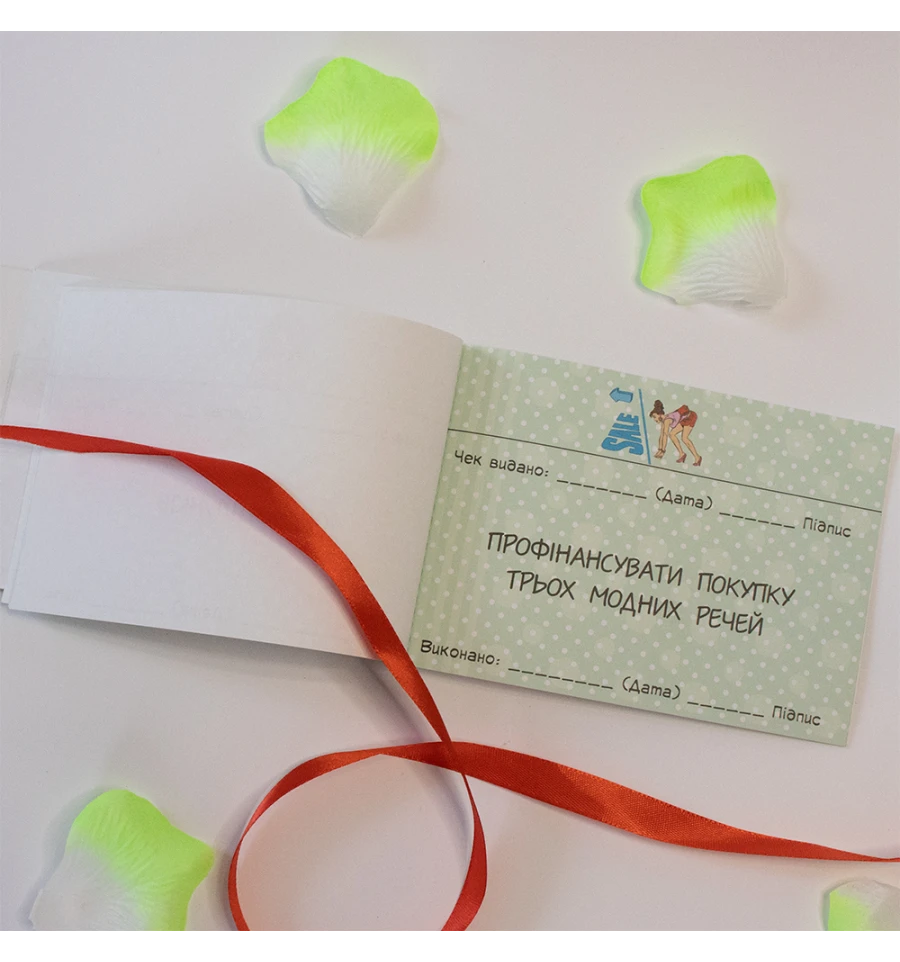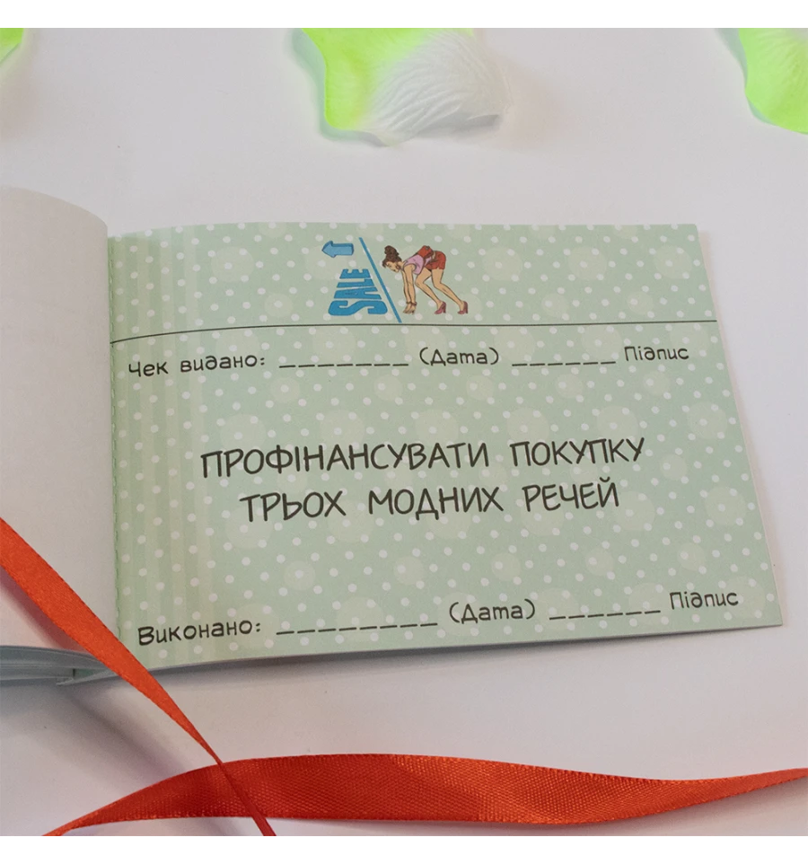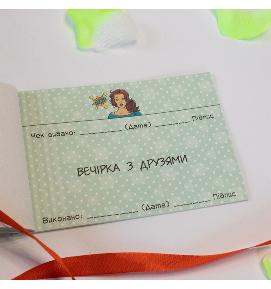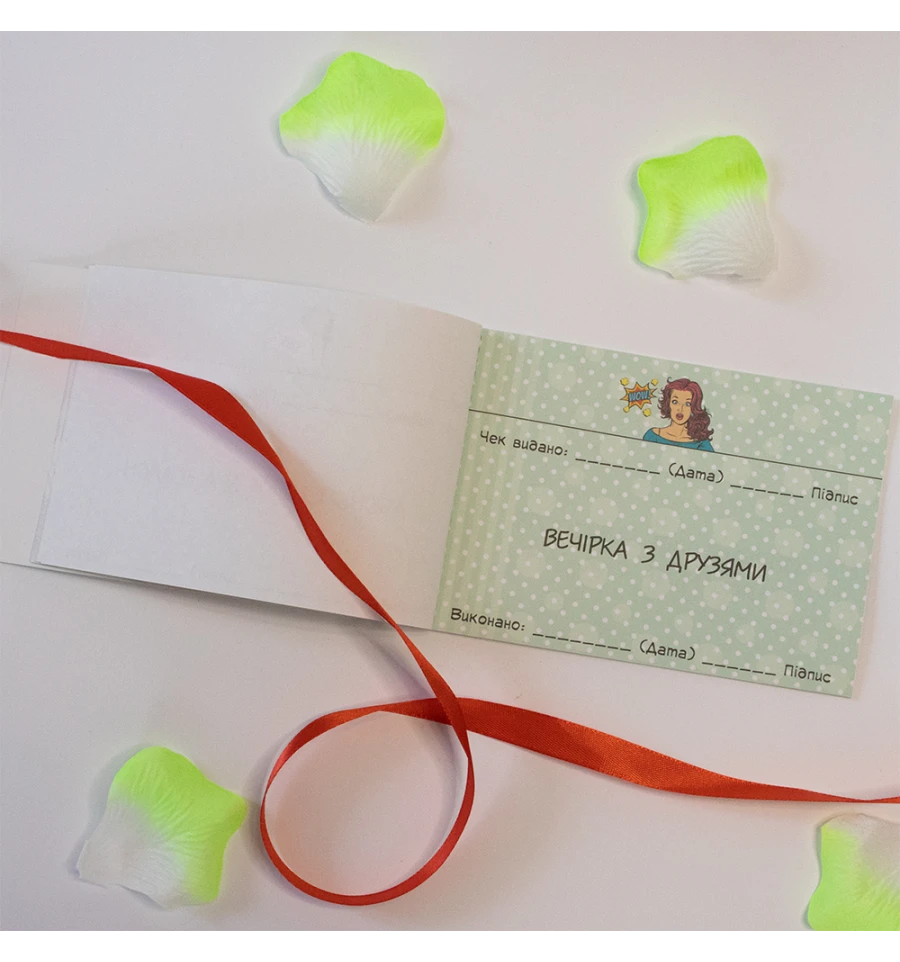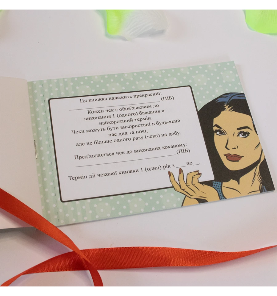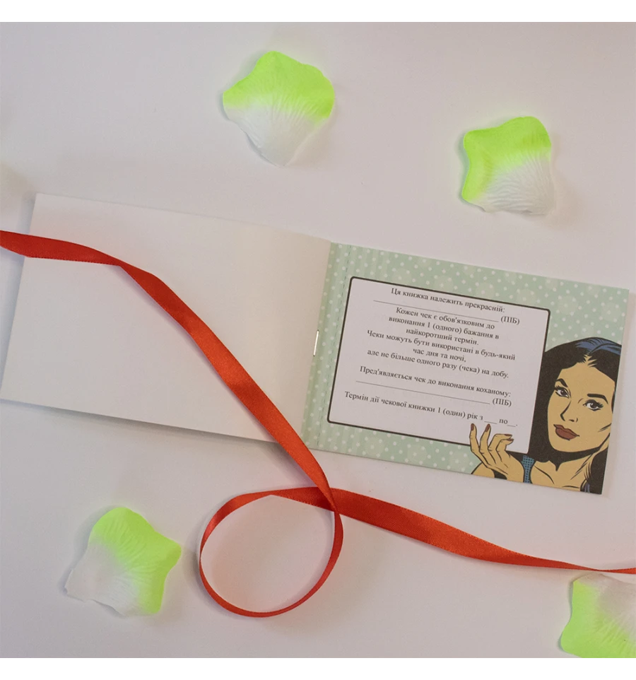 Чековая книжка желаний ДЛЯ КОХАНОЇ (укр. ) – самый дорогой подарок, так как Вы дарите самые бесценные вещи Любовь и Внимание. Это прекрасный и незабываемый подарок на любой праздник для Вашей половинки. С подарком Чековая книжка желаний ДЛЯ КОХАНОЇ (укр. ) Вы обязуетесь выполнить 15 простых, но в тоже время очень приятных квестов или желаний вашей девушки в установленный период. Книжка состоит из 16 страниц, странички с подробной инструкцией по использованию и 15 дизайнерских купонов с желаниями все на русском языке. Например – завтрак в постель, 100 поцелуем, приватный танец и многие другие. Ваша любимая выбирает купон с желанием, а Вы должны его выполнить. В дополнение чековой книжке Вы можете приобрести сладкий сюприз и оригинальный подарок 100 и Одна Причина в нашем интернет магазине PrazdnikShop. Купив Чековая книжка желаний ДЛЯ КОХАНОЇ (укр. ) вы получаете не только качественный товар, а и 100% позитивных впечатлений от приобретения.