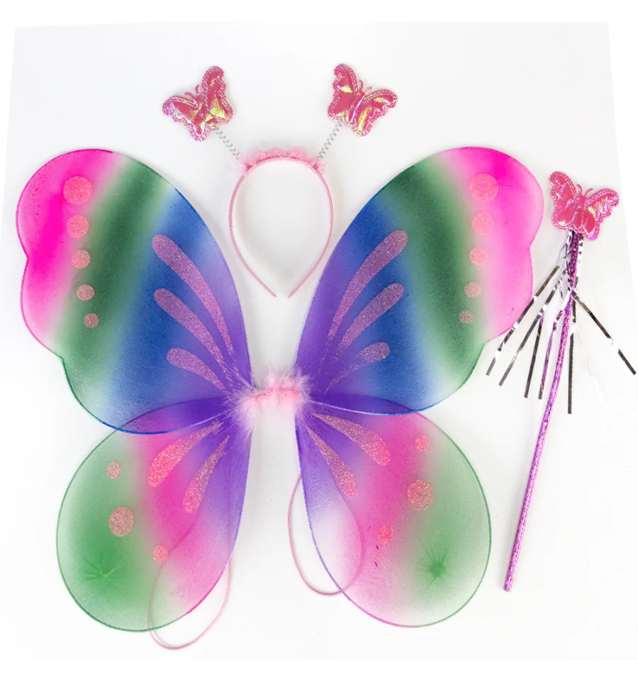 Дополнительные характеристики | В наборах отличаются цвета ободков с антенками, есть - голубой, розовый. Комплектация - крылья, ободок с антенками, волшебная палочка. Размеры - крылья - 40х40х0, 5см, ободок с антенками - 24х22х2см, волшебная палочка38х12х1см |
