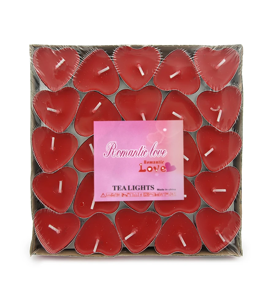Как легко сделать романтическую атмосферу в доме? Правильно, темнота и свечи. Романтические свечи создают интимный свет, идеальный чтобы провести время со своим близким человеком. Свечи чайные романтические прекрасная возможность сознаться второй половинке в своих чувствах. Свечи в форме сердец отличный подарок друзьям и знакомым. Также можно всегда украсить праздник всех влюбленных или небольшую вечеринку. Свечи изготовлены из парафина залитого в алюминиевый корпус из-за этого их называют свечи-таблетки или чайные свечи. Используются свечи Сердце в аромалампах, декоративных светильниках, украшении интерьера и как плавающие свечи. Чайные плавающие свечи отличаются самой высокой экономичностью, так как парафин не может покинуть зону плавления в алюминиевом корпусе и сгорает до конца. В упаковке 50 шт.