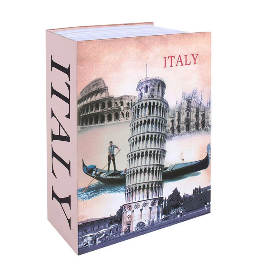 Книга сейф (18см) Италия – стильный, аристократический подарок для тех, кто любит читать и считать! Переданный нам от деда-прадеда способ хранить свои сбережения в книгах нашел свое современное воплощение! Оригинальный сейф в виде книги, книга-тайник, надежно будет сохранять ценности своего хозяина, находясь в книжном шкафу с обычными книгами. Металлическая коробка замаскирована под обычную книгу, облицована пластиковой обшивкой с принтом пизы каноэ и надписью ITALY. Внутренние размеры позволят спрятать пачки купюр толщиной до 5 см, а также хранить документы размером 17х10см. Каркас книги-обманки обработан таким образом, чтобы создать иллюзию множества страниц, соединённых вместе. Выглядит очень реалистично. В ряду на полке с другими книгами практически не отличить от обычной книги. Книга сейф – отличный подарок для ваших друзей, родных, коллег и начальства. Можете подарить такой подарок на день рождения или оригинально вручить на свадьбу молодоженам. В комплекте с книгой поставляется 2 ключа.