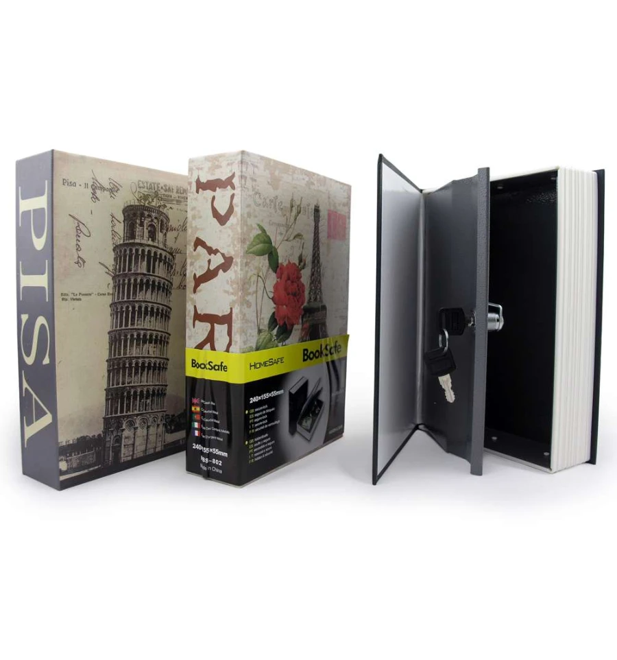 Книга сейф (24см) Париж – стильный, аристократический подарок для тех, кто любит читать и считать! Переданный нам от деда-прадеда способ хранить свои сбережения в книгах нашел свое современное воплощение! Оригинальный сейф в виде книги, книга-тайник, надежно будет сохранять ценности своего хозяина, находясь в книжном шкафу с обычными книгами. Металлическая коробка замаскирована под обычную книгу, облицована пластиковой обшивкой с Эйфелевой башней и надписью PARIS. Внутренние размеры позволят спрятать пачки купюр толщиной до 5 см, а также хранить документы размером 17х10см. Каркас книги-обманки обработан таким образом, чтобы создать иллюзию множества страниц, соединённых вместе. Выглядит очень реалистично. В ряду на полке с другими книгами практически не отличить от обычной книги. Книга сейф – отличный подарок для ваших друзей, родных, коллег и начальства. Можете подарить такой подарок на день рождения или оригинально вручить на свадьбу молодоженам. В комплекте с книгой поставляется 2 ключа.
