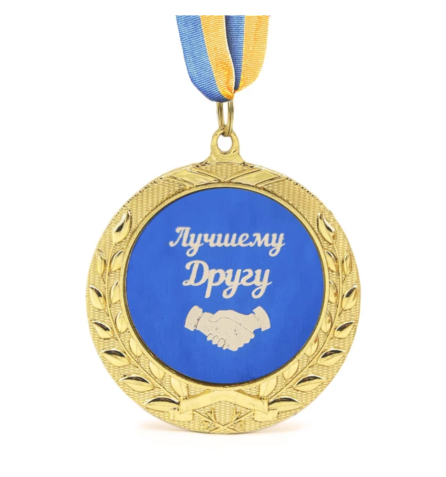 Прекрасная медаль для прекрасного человека. Подобные забавные награды – замечательный подарок. Презентуйте другу красивую медаль синего цвета, на которой золотом запечатлено крепкое мужское рукопожатие и красивым почерком написано Лучшем другу. Необязательно ждать праздника или памятной даты. Такие приколы приятно получать просто так, без повода, они показывают, как высоко вы цените друзей и их поддержку. Хотите сделать приятное другу и раздумываете, что подарить? Выбирайте дружескую медаль на нашем сайте. Лучший подарок для лучшего друга. Медаль подарочная в золотом обрамлении лавровых листьев - произведет впечатление и несомненно станет отличным подарком на память! Медаль выполнена из сплавов различных металлов с покрытием благородного золотистого цвета нанесенного булатным способом, диаметром 7 см, размером жетона 5см и желто-голубой репсовой лентой длиною 40см. Медаль не подходит для выполнения на ней гравировки. Наш магазин предлагает товары оптом и для дропшипперов, вы можете оформить заказ на сайте PrazdnikShop и задать любые интересующие вопросы менеджеру, заказав звонок на нашем сайте.