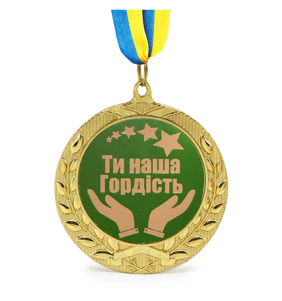 Медаль подарочная Ти наша гордiсть- отличная универсальная и оригинальная награда, ее можно вручить коллеге или сотруднику, либо наградить отличившегося в коллективе. Хотите отметить окончание ВУЗа студента либо поздравить своего ребенка с окончанием школы? Медаль подарочная 43268 Ти наша гордiсть в золотом обрамлении лавровых листьев - произведет впечатление и несомненно станет отличным подарком на память! Медаль выполнена из сплавов различных металлов с покрытием благородного золотистого цвета нанесенного булатным способом, диаметром 7 см, размером жетона 5см и желто-голубой репсовой лентой длиною 40см. Медаль не подходит для выполнения на ней гравировки. Надпись нанесена на украинском языке. Среди нашего широкого ассортимента товаров, Вы найдете множество необычных и оригинальных подарков для различных мероприятий. Наш магазин предлагает товары оптом и для дропшипперов, вы можете оформить заказ на сайте PrazdnikShop и задать любые интересующие вопросы менеджеру, заказав звонок на нашем сайте.
