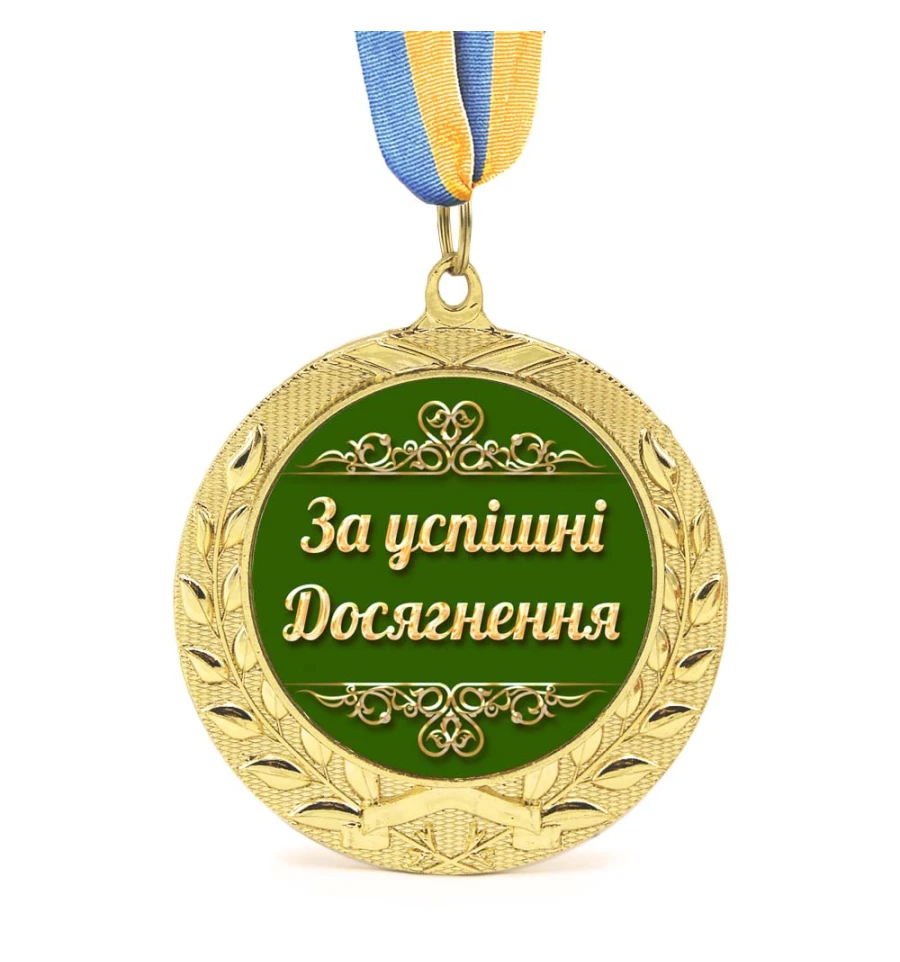 Медаль подарочная За успішні досягнення - отличная универсальная и оригинальная награда, ее можно вручить коллеге или сотруднику, либо наградить отличившегося в коллективе. Хотите отметить окончание ВУЗа студента либо поздравить своего ребенка с окончанием школы? Медаль подарочная За успішні досягнення в золотом обрамлении лавровых листьев - произведет впечатление и несомненно станет отличным подарком на память! Медаль выполнена из сплавов различных металлов с покрытием благородного золотистого цвета нанесенного булатным способом, диаметром 7 см, размером жетона 5см и желто-голубой репсовой лентой длиною 40см. Медаль не подходит для выполнения на ней гравировки. Надпись нанесена на украинском языке. Среди нашего широкого ассортимента товаров, Вы найдете множество необычных и оригинальных подарков для различных мероприятий. Наш магазин предлагает товары оптом и для дропшипперов, вы можете оформить заказ на сайте PrazdnikShop и задать любые интересующие вопросы менеджеру, заказав звонок на нашем сайте.