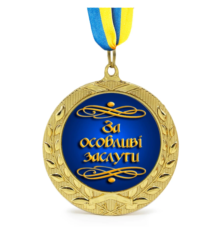 Медаль подарочная За особливі заслуги - отличная и оригинальная награда, ее можно вручить только тому человеку, который для Вас сделал доброе дело, совершившим благородный поступок. Подарок символичен и необычен, говорящий как дорог для Вас поздравляемый человек! Медаль подарочная 43262 За особливі заслуги в золотом обрамлении лавровых листьев - произведет впечатление и несомненно станет отличным подарком на память! Медаль выполнена из сплавов различных металлов с покрытием благородного золотистого цвета нанесенного булатным способом, диаметром 7 см, размером жетона 5см и желто-голубой репсовой лентой длиною 40см. Медаль не подходит для выполнения на ней гравировки. Среди нашего широкого ассортимента товаров, Вы найдете множество необычных и оригинальных подарков для различных мероприятий. Наш магазин предлагает товары оптом и для дропшипперов, вы можете оформить заказ на сайте PrazdnikShop и задать любые интересующие вопросы менеджеру, заказав звонок на нашем сайте.