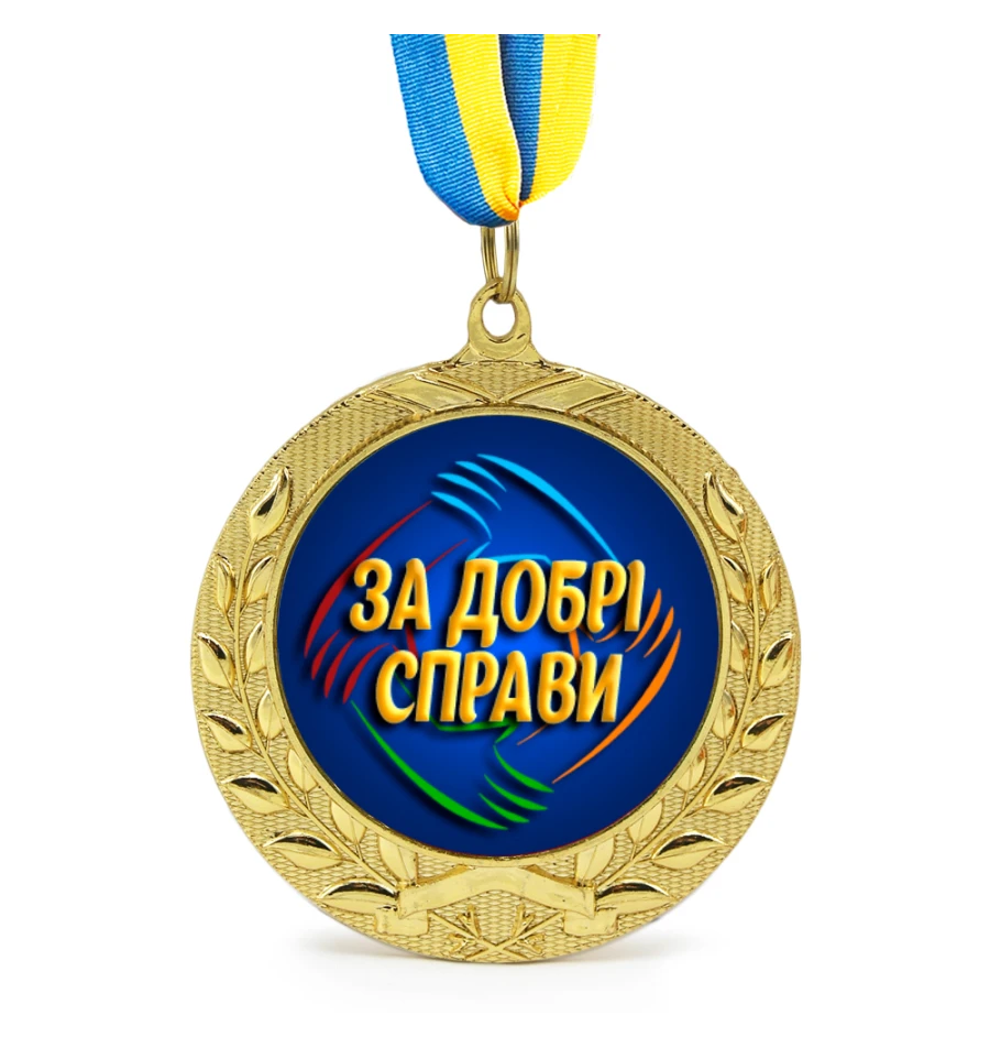 Медаль подарочная За добрі справи - отличная и оригинальная награда, ее можно вручить только тому человеку, который для Вас сделал доброе дело, совершившим благородный поступок. Подарок символичен и необычен, говорящий как дорог для Вас поздравляемый человек! Медаль подарочная За добрі справи в золотом обрамлении лавровых листьев - произведет впечатление и несомненно станет отличным подарком на память! Медаль выполнена из сплавов различных металлов с покрытием благородного золотистого цвета нанесенного булатным способом, диаметром 7 см, размером жетона 5см и желто-голубой репсовой лентой длиною 40см. Медаль не подходит для выполнения на ней гравировки. Среди нашего широкого ассортимента товаров, Вы найдете множество необычных и оригинальных подарков для различных мероприятий. Наш магазин предлагает товары оптом и для дропшипперов, вы можете оформить заказ на сайте PrazdnikShop и задать любые интересующие вопросы менеджеру, заказав звонок на нашем сайте.