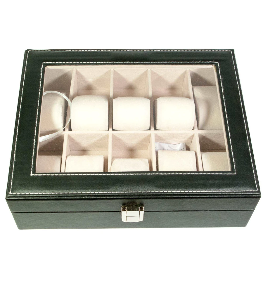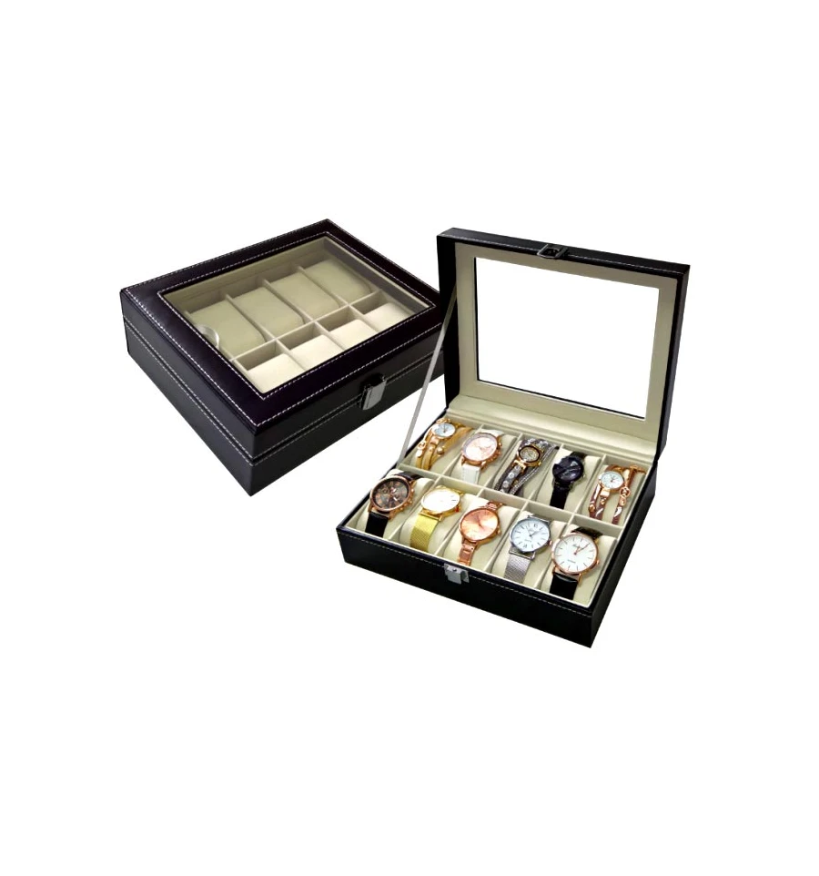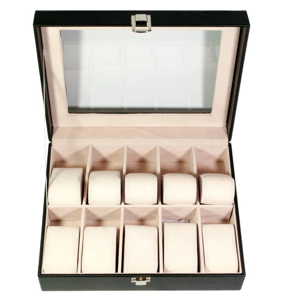 Шкатулка для часов на 10 штук имеет стильный и элегантный дизайн, который добавит роскоши и изыска в вашу коллекцию. Крышка шкатулки оснащена прозрачным окном, которое позволяет вам наслаждаться видом часов без необходимости открывать ее.