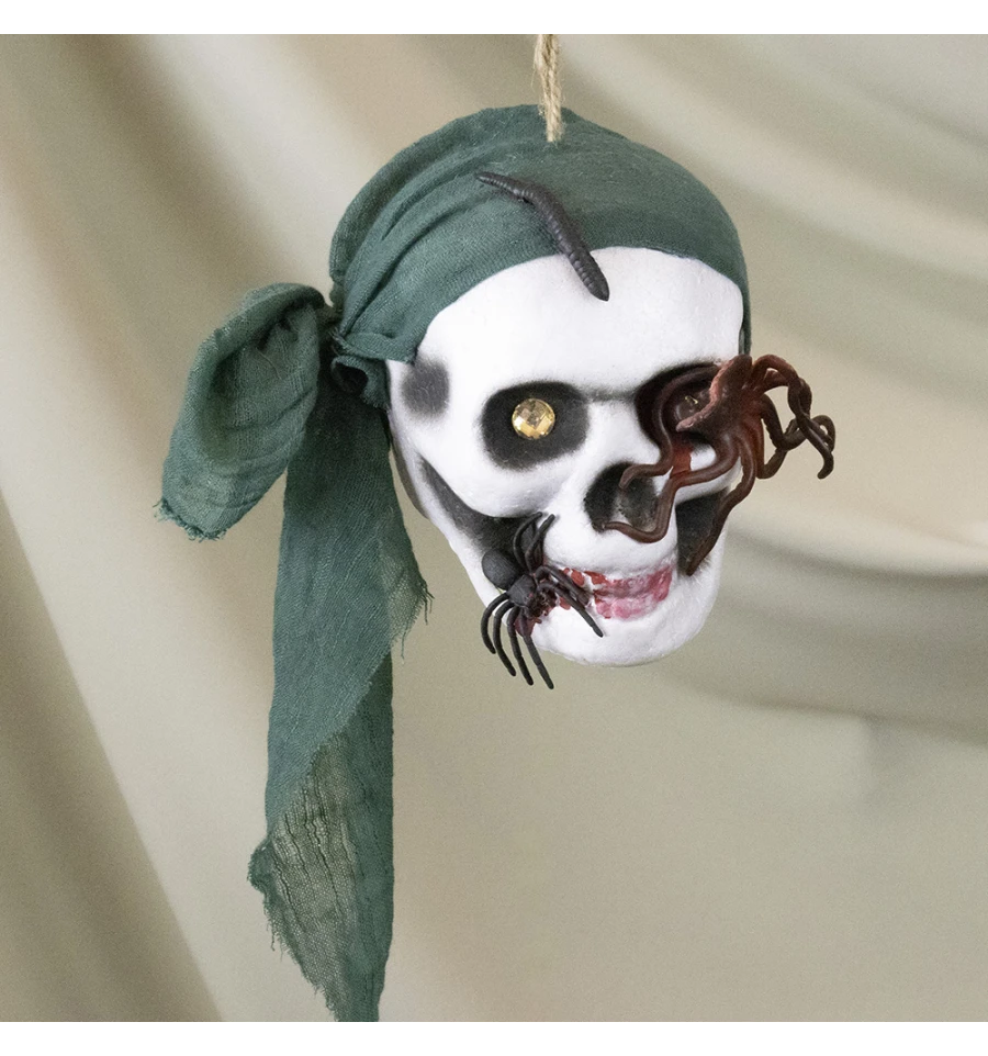 Декор подвесной череп Пират Крюк 13797 (бутылочно-зеленый) - украшение на Хэллоуин из серии подвесного декора с петелькой для подвешивания на вечеринку в стиле Santa Muerte или Хэллоуин. Череп пирата изготовлен из качественного материала, который не рассыпается, пенополистирола, бондана - марлевка цвета бордо. Особого шарма готическому пиратскому черепу придает осьминог, который будь-то вылазит из глазницы. А золотой глаз кристалл будет эффектно переливатся при попадании света. Идеально подходит для украшения арт-пространства клуба, фото зоны на Хэллоуин или пиратскую вечеринку. Просто повесьте на дверь или стену, чтобы удивить ваших гостей во время праздника Дня всех мертвых. Также декор можно поставить на стол, бар или другую локацию. Рекомендуем к этому подвесному черепу готическому еще паутину и череп светильник, которые помогут Вам воссоздать мистическую атмосферу. Интернет-магазин PrazdnikShop предлагает купить висячие украшения для дома с привидениями по лучшим ценам в Украине.