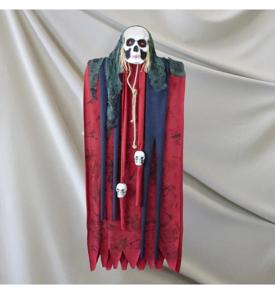 Декор для хэллоуина Смерть (130см) красный 13792 - украшение на Хэллоуин из серии подвесного декора с петелькой для подвешивания на вечеринку в стиле Santa Muerte или Хэллоуин. Призрачный Череп изготовлен из качественного материала, который не рассыпается, пенополистирола, балахон-искусственный трикотаж, косынка-сатин. Особого шарма висячей смерти придают сочетание шпагата на шее с черепами. Красные кристаллы в глазах эффектно переливаются и создают впечатление горящих глаз при попадании на них света. Идеально подходит для украшения арт-пространства клуба, фото зоны на Хэллоуин. Впечатляюще подвесной декор выглядит в клубах при освещении флуоресцентными лампами - белый цвет черепов светится. Просто повесьте на дверь или стену, чтобы удивить ваших гостей во время праздника Дня всех мертвых. Рекомендуем к этому готическому подвесному черепу еще паутину, которая поможет Вам воссоздать мистическую атмосферу. Интернет-магазин PrazdnikShop предлагает купить висячие украшения для дома с привидениями по лучшим ценам в Украине.