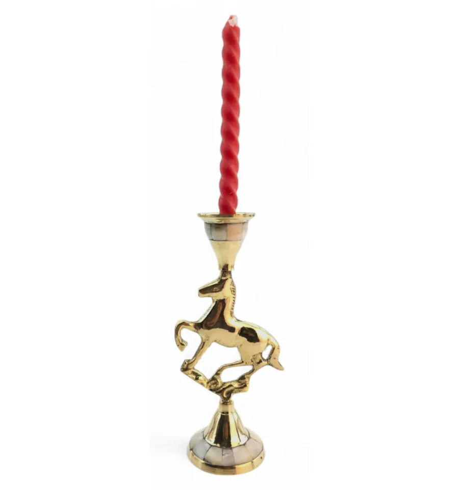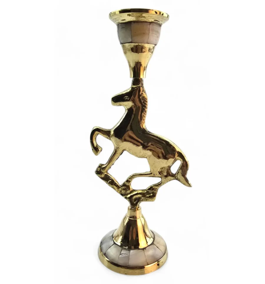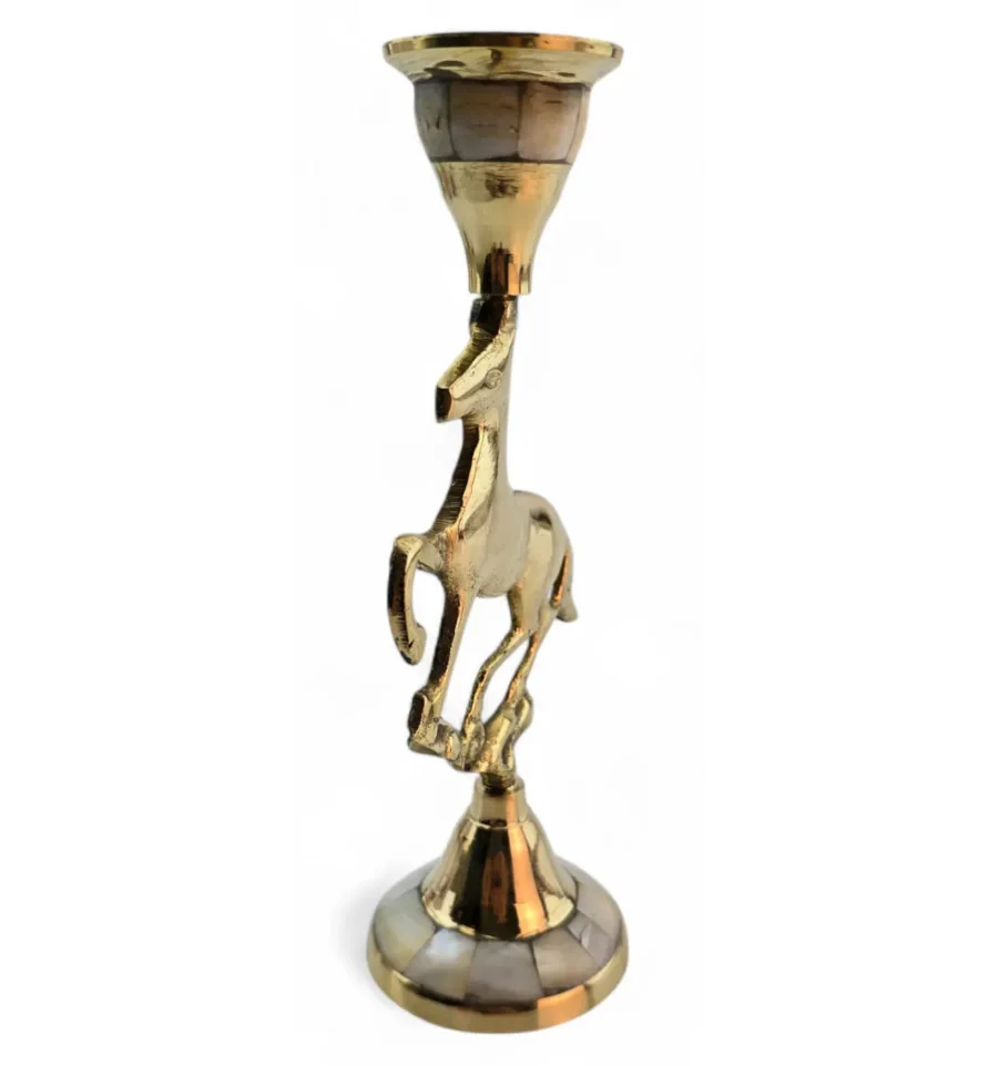 Элегантный бронзовый подсвечник с фигуркой скачущей лошади олицетворяет энергию, свободу и движение. Перламутровые вставки подчёркивают утончённый стиль изделия. Подходит для тонкой свечи диаметром 2 см.