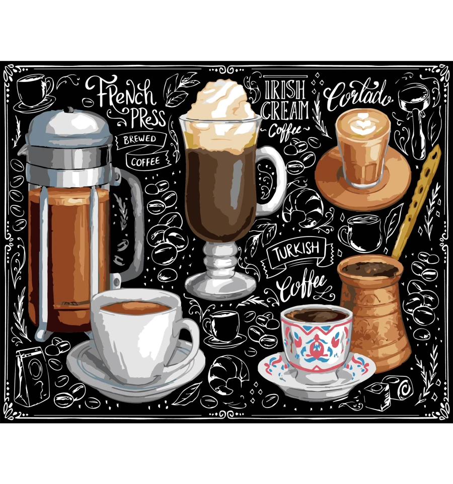 Картина по номерам ПРЕМИУМ Мир кофе на черном фоне размером 40х50 см (AH1173-19)Картины по номерам от украинского производителя объединяют творчество с игрой. Они развивают фантазию, улучшают память и мелкую моторику. А процесс рисования снижает тревогу и снимает стресс.
