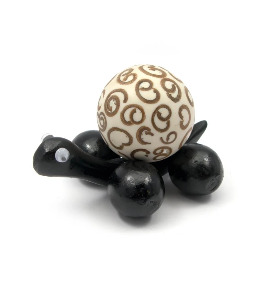 Тело черепахи изготовлено из гладкого, полированного черного дерева, а панцирь представляет собой красиво вырезанный шар из корицы с замысловатыми ручными узорами. Лапки черепахи специально сделаны подвижными, что позволяет ей двигаться, добавляя игривый элемент к ее эстетической привлекательности.