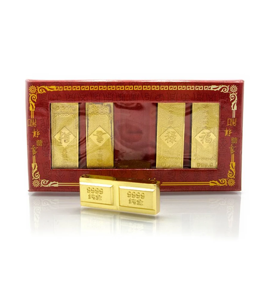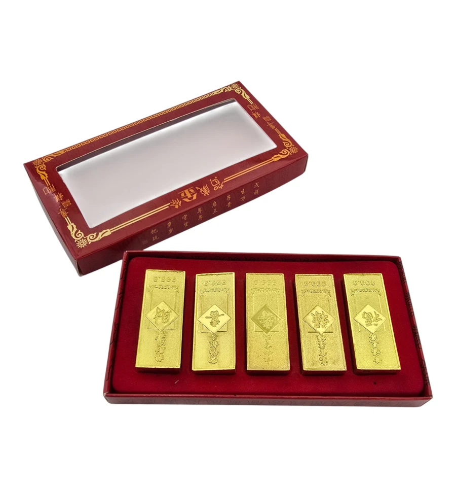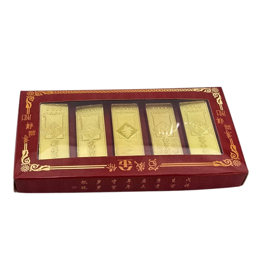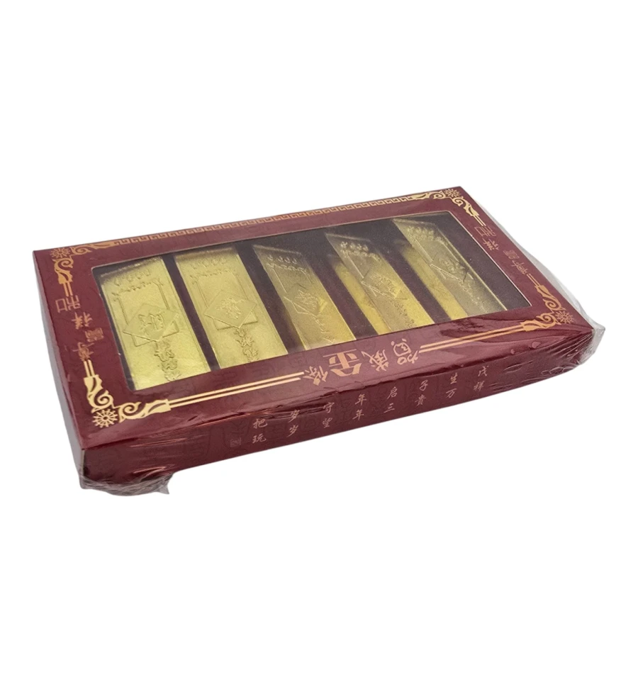Декоративные слитки под золото в классическом китайском стиле. В наборе 5 штук в красной коробке с прозрачным окном. Подходят как символ достатка в фэншуй-декоре, для праздничного оформления, фотосъемок и в качестве небольшого подарка. Маркировка и гравировка носят декоративный характер.