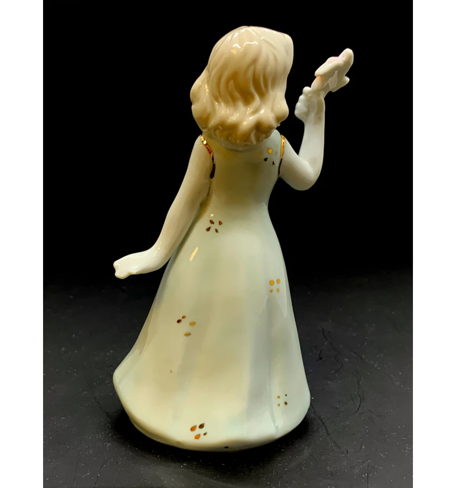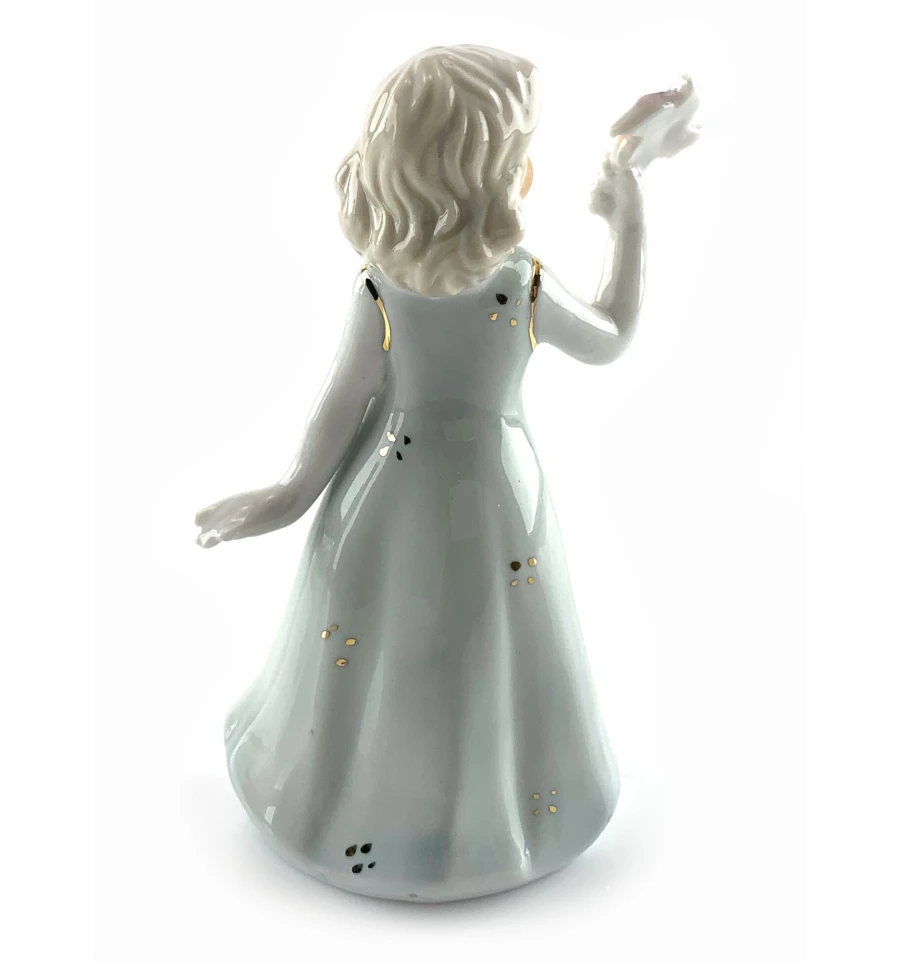 Эта изысканная статуэтка переносит вас в мир мечтаний и нежности. Девушка в нежном белом платье с золотистой туфелькой и ветрячком в руке излучает элегантность и шарм.