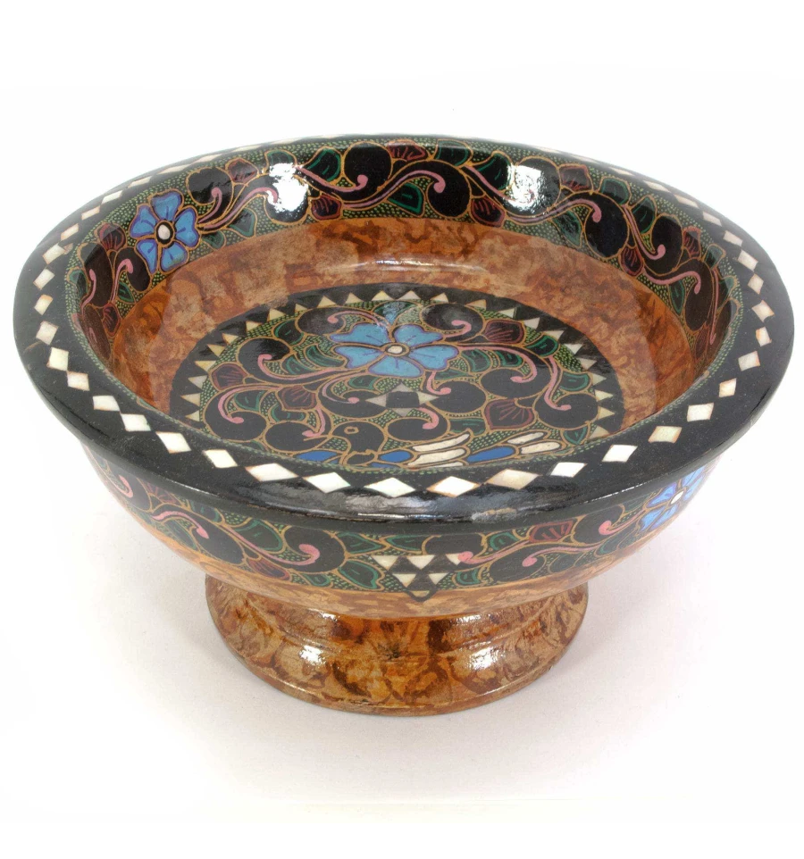 Представляем вам уникальное блюдо для фруктов, выполненное вручную мастерами из Индонезии на острове Ломбок. Блюдо изготовлено из цельного дерева и инкрустировано перламутром, что придает ему особую изысканность и шарм. Роспись выполнена вручную в виде красочного гекона на мраморно-терракотовом фоне, что делает блюдо ярким и привлекательным.