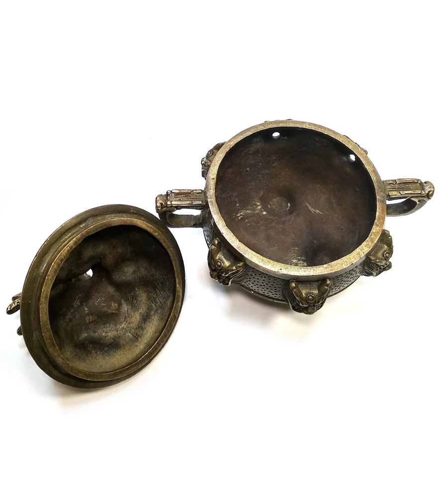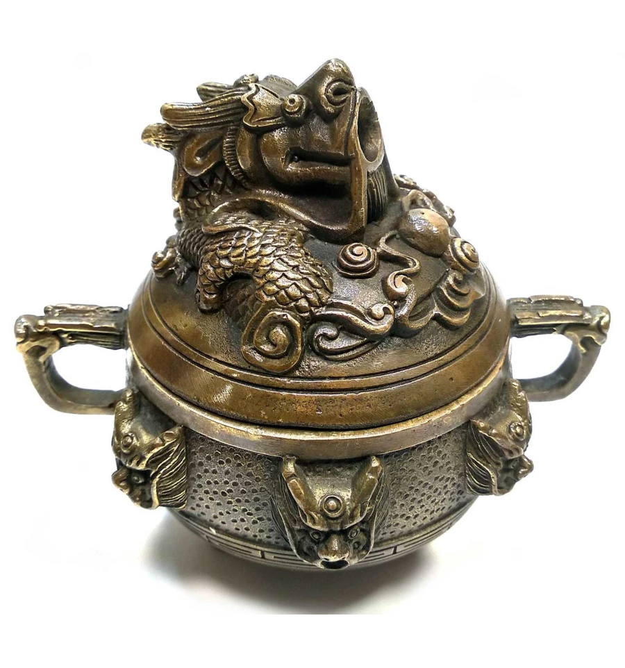 Высота курительницы составляет 95 мм, а ширина - 120 мм. Диаметр горлышка равен 75 мм, а общий диаметр без ручек - 90 мм. Крышка изделия украшена изображением китайского дракона, который символизирует силу, мудрость и удачу. По окружности курительницы вы найдете шесть образов китайских драконов, которые придают изделию особую привлекательность и символическую ценность.