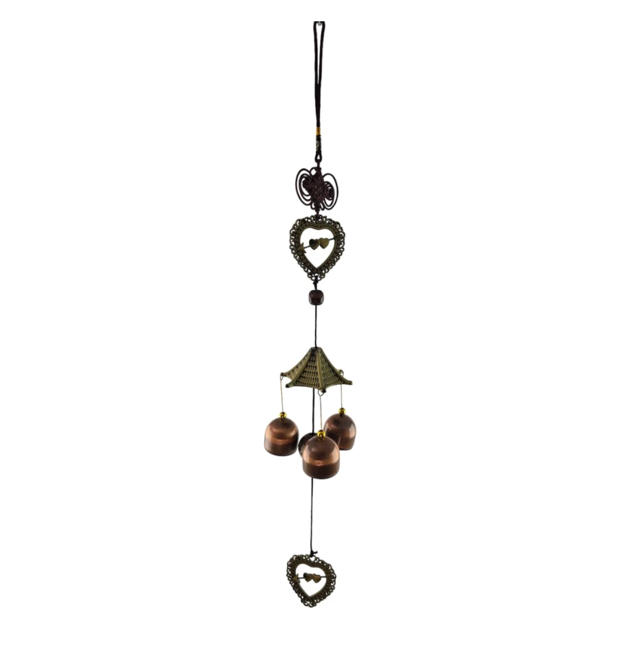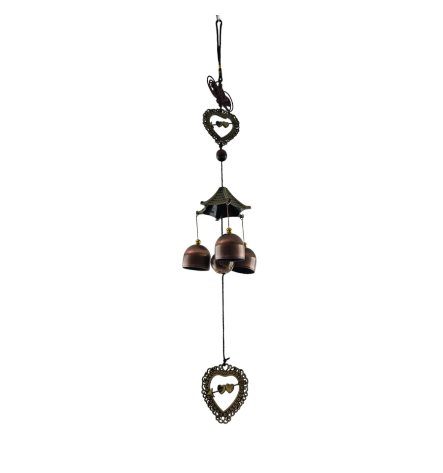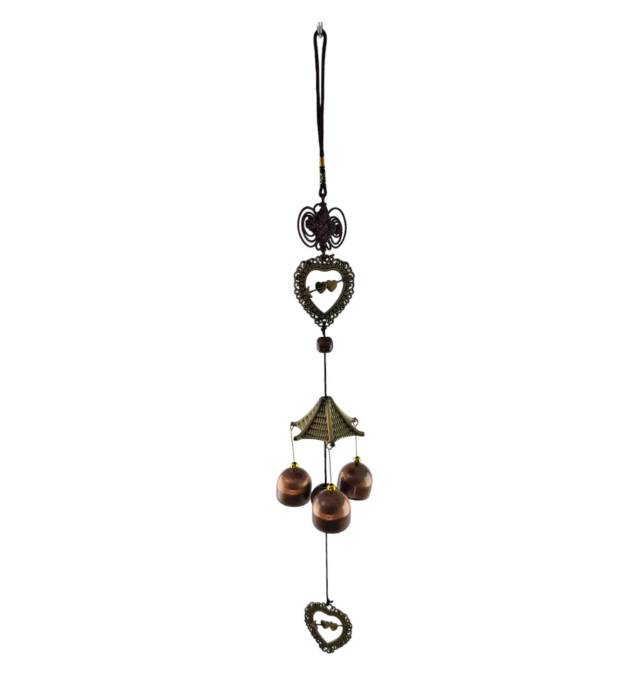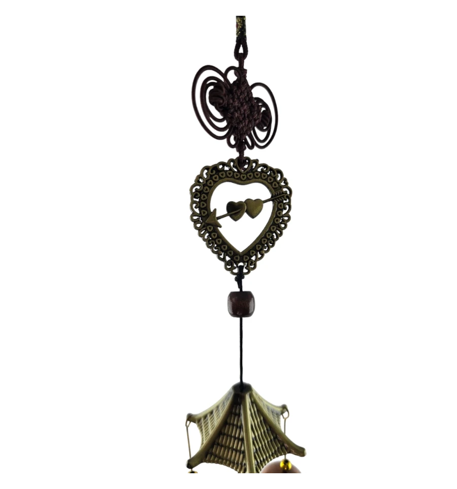 Пагода, также выполненная в бронзовом оттенке, представляет собой олицетворение спокойствия и мудрости. От нее идут три колокольчика, излучающие нежный медный звон, создавая мелодию, которая ласкает слух и дарит умиротворение.