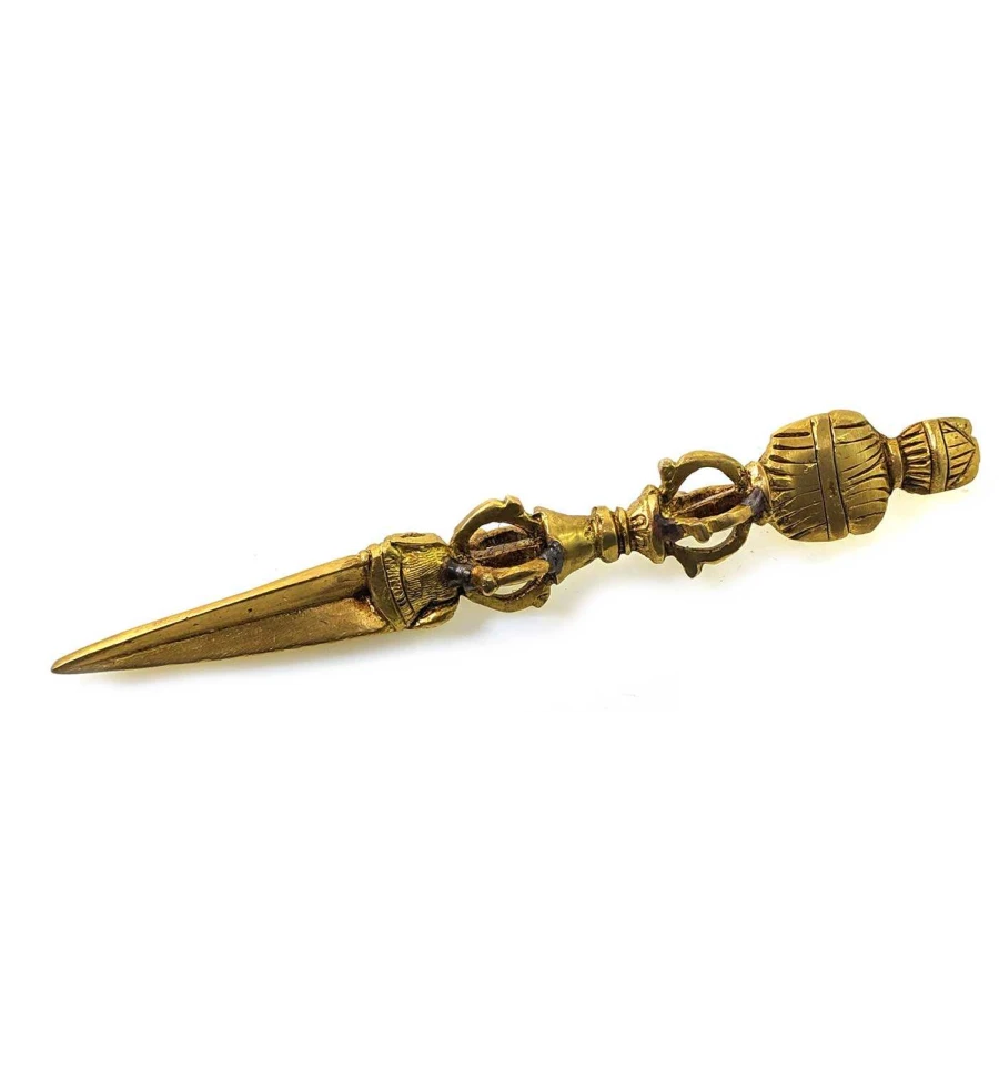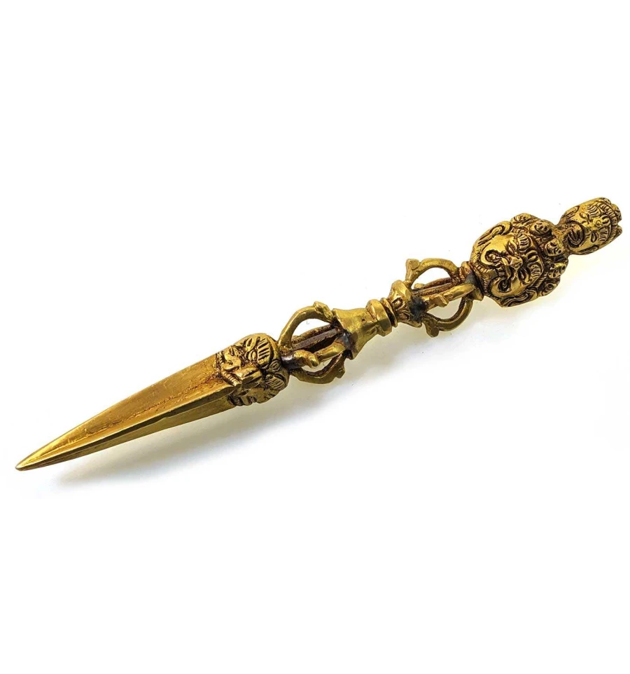 Кинжал ритуальный Пурба – это традиционное ритуальное оружие, используемое в некоторых культурах Южной Азии и Тибета для проведения обрядов и ритуалов. Этот кинжал изготовлен из бронзы и имеет длину 21 см и ширину 3 см. Его форма напоминает трезубец или штык и часто считается символом божества Шивы. Кинжал Пурба может использоваться для проведения различных церемоний и ритуалов, связанных с защитой, благополучием, очищением и духовным развитием. Он также может служить украшением или коллекционным предметом.
