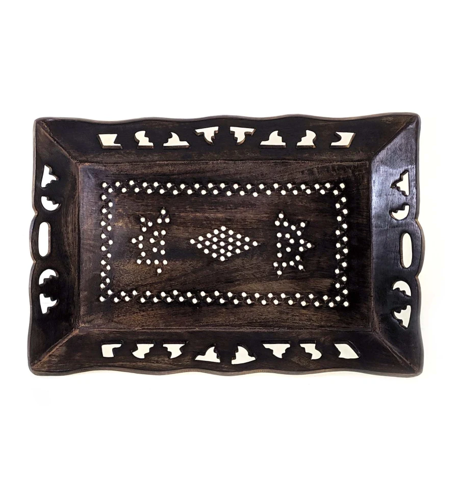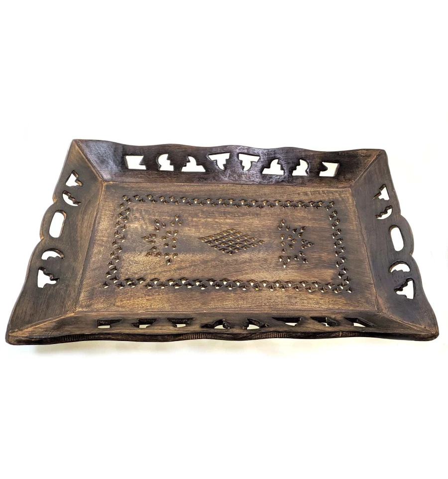 Этот поднос сделан из мангового дерева, имеет резьбу и коричневый цвет. Размеры составляют 38х25х4 см, что делает его достаточно большим для подачи различных блюд на столе.