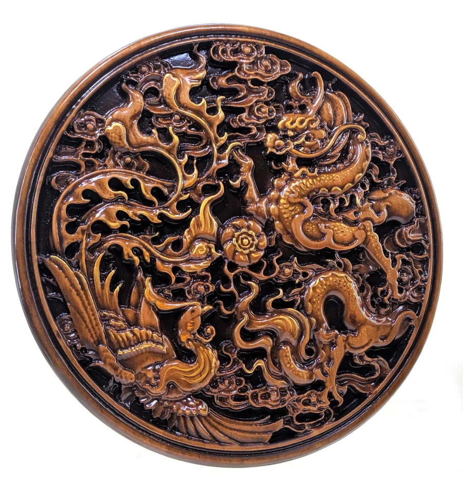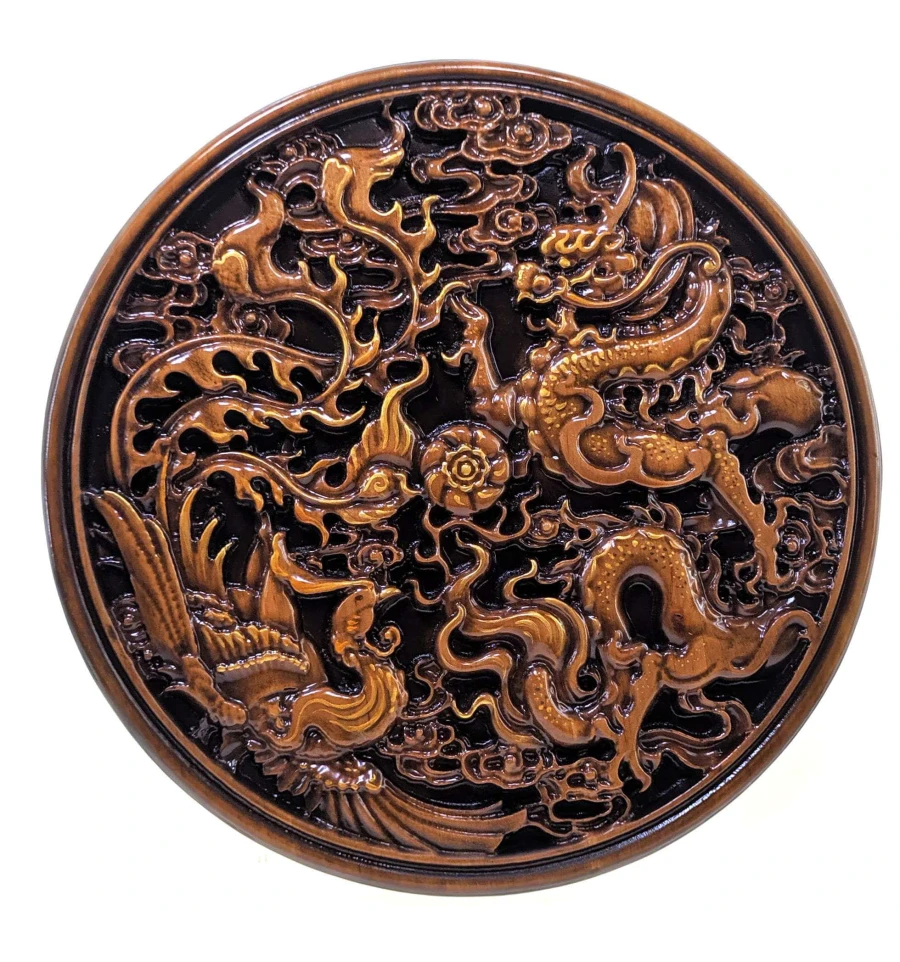 Панно «Дракон и феникс », резное, (d-26.5 см) массив дерева, покрыто патиной, эмалями и лаком