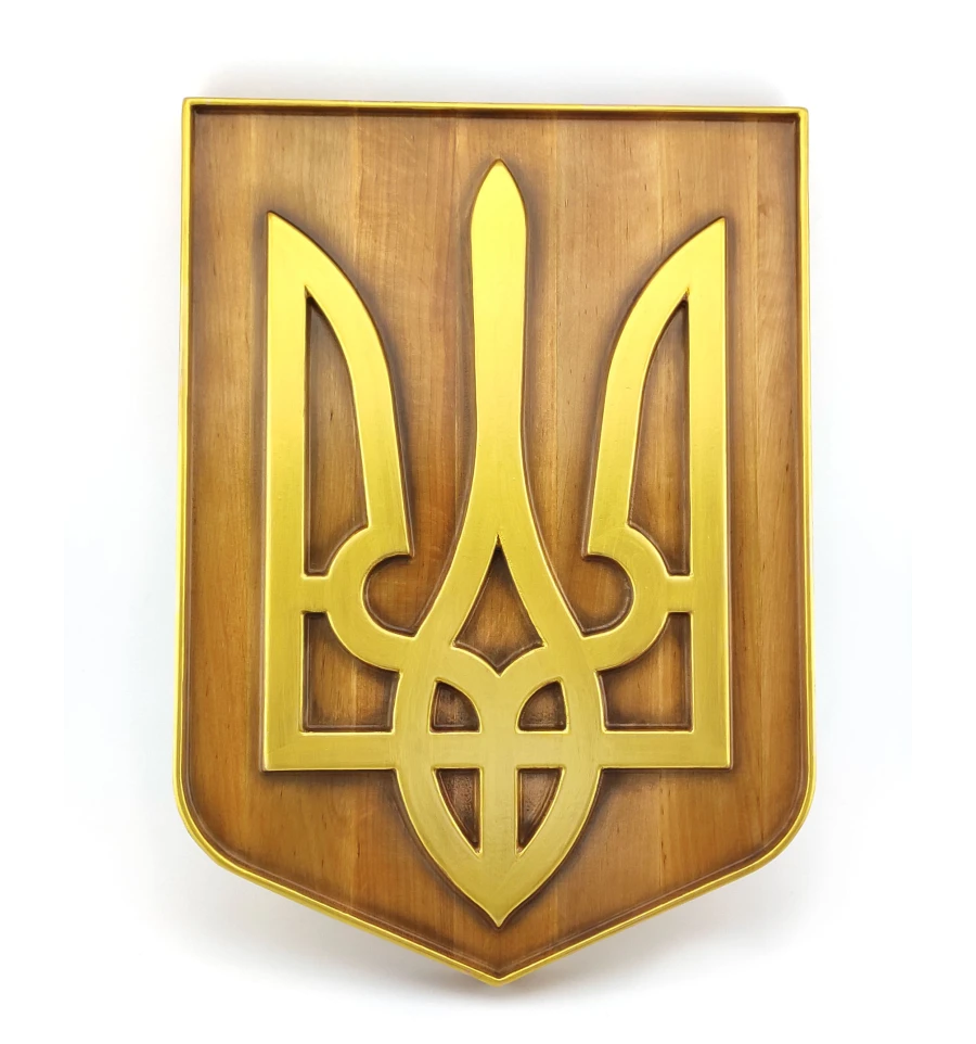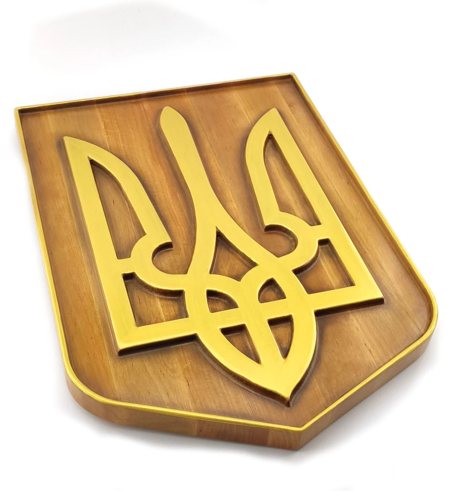 Панно «Герб Украины» (39×28×2.4 см), из натурального дерева, резное, покрыто патиной, лаком, эмалью-золото