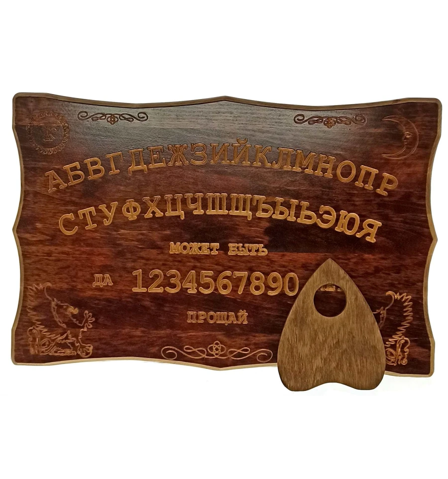 Доска для спиритических сеансов вызова душ умерших с нанесёнными на неё буквами алфавита, цифрами от 1 до 9 и нулём, словами «да» и «нет» и со специальной планшеткой-указателем. Специальная указка или планшетка — указатель передвигается с помощью энергии духов или умерших, двигая стрелку от буквы к букве, от цифры к цифре, таким образом оставляя послания живым и отвечая на вопросы
