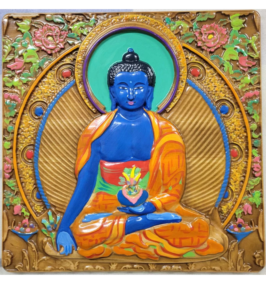 Панно«Будда медицины» (29×29×2.3 см), массив ольхи, резное, лак, эмали, массив дерева