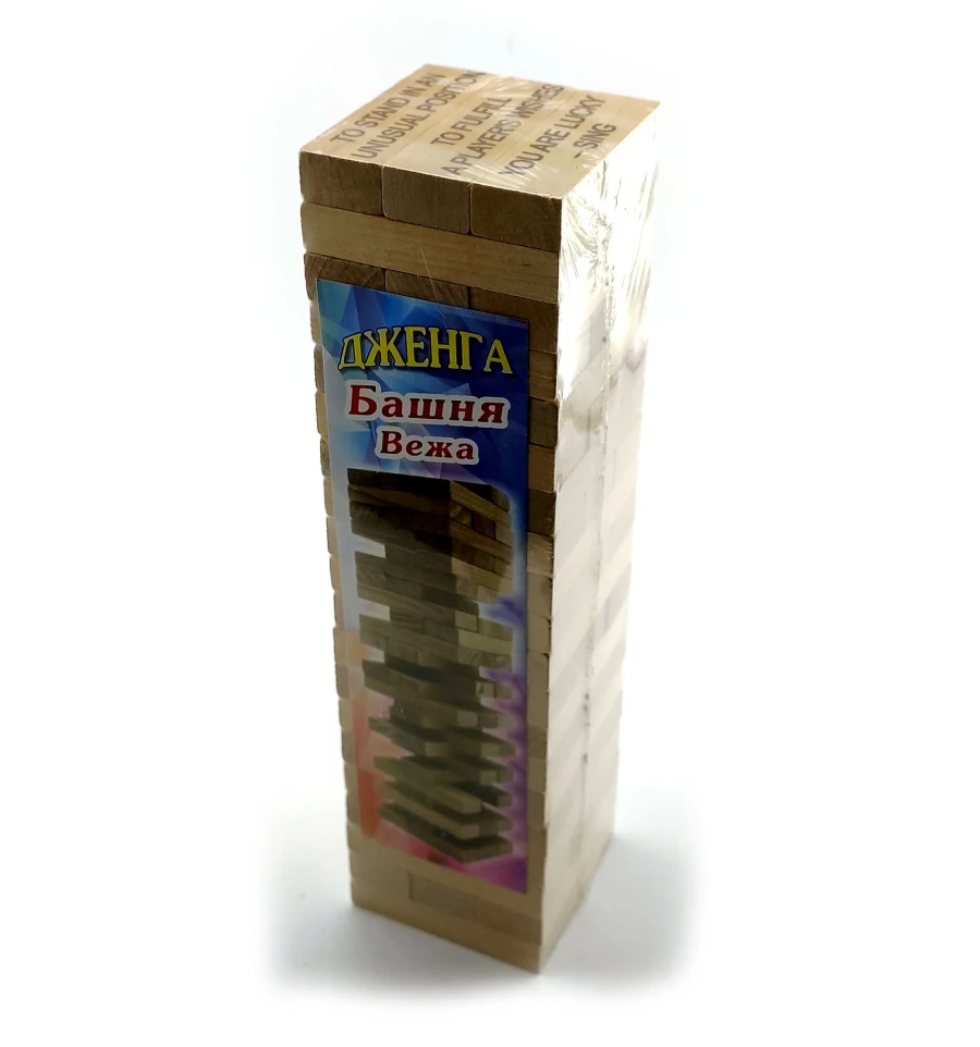 Дженга сделана из массива дерева.Дженга – это башня из деревянных брусков, которая растёт вверх, падает и снова растёт! Дженга – игра на ловкость рук, смекалку и чувство равновесия. В настольной игре Дженга (Jenga) Вам предстоит выстраивать башню из деревянных брусков, вынимая бруски с нижних «этажей» и докладывая их наверх. Возраст от 14+.