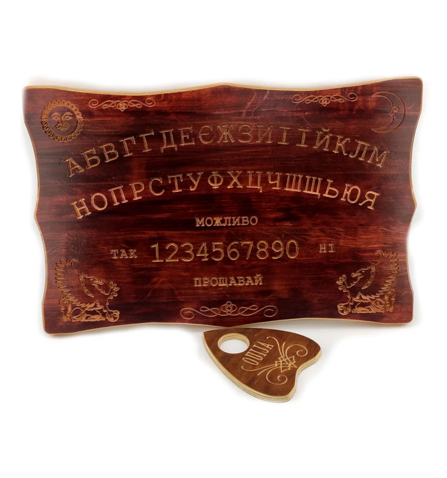 Эксклюзивная спиритическая доска Уиджа (OUIJA), на украинском языке,(46×30×1,8см),массив ольхи, резная , покрыта тонировкой и лаком. Эксклюзивная спиритическая доска Уиджа (OUIJA) - это доска для контакта с духами, которая используется в рамках оккультизма и эзотерики. Доска представляет собой плоское поверхность, на которой изображены буквы, цифры, слова "Да", "Нет" и другие символы, с помощью которых участники сеанса могут задавать вопросы и получать ответы от духов.