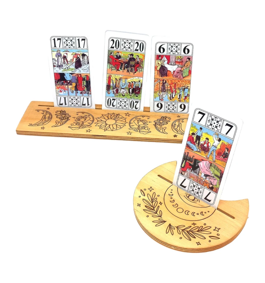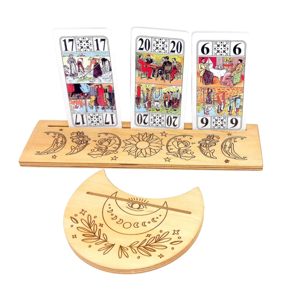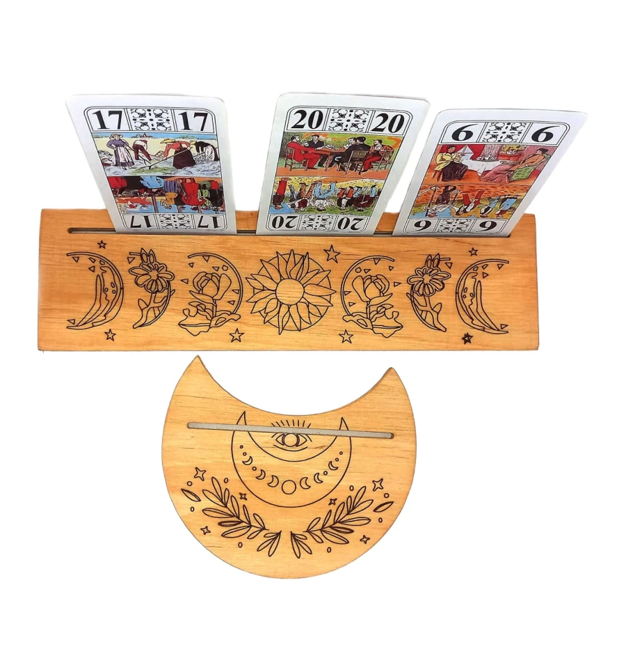 Комплект деревянных подставок под карты ТАРО, который мы предлагаем, содержит две разных подставки: одну для размещения одной карты ТАРО, а вторую для размещения трех карт ТАРО.