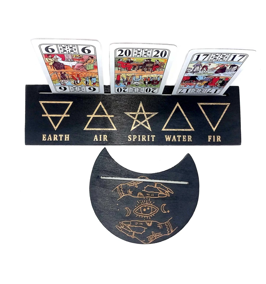 Комплект деревянных подставок под карты ТАРО, который мы предлагаем, содержит две разных подставки: одну для размещения одной карты ТАРО, а вторую для размещения трех карт ТАРО.