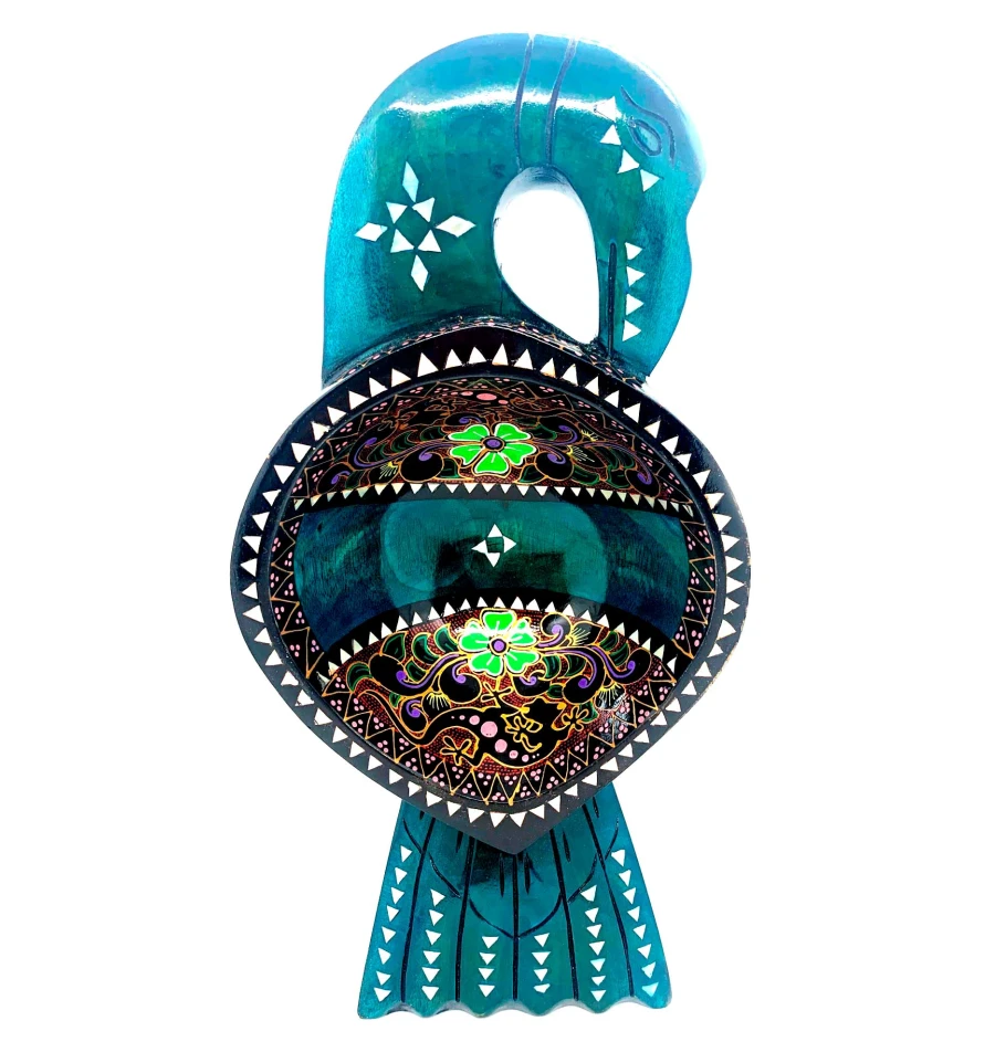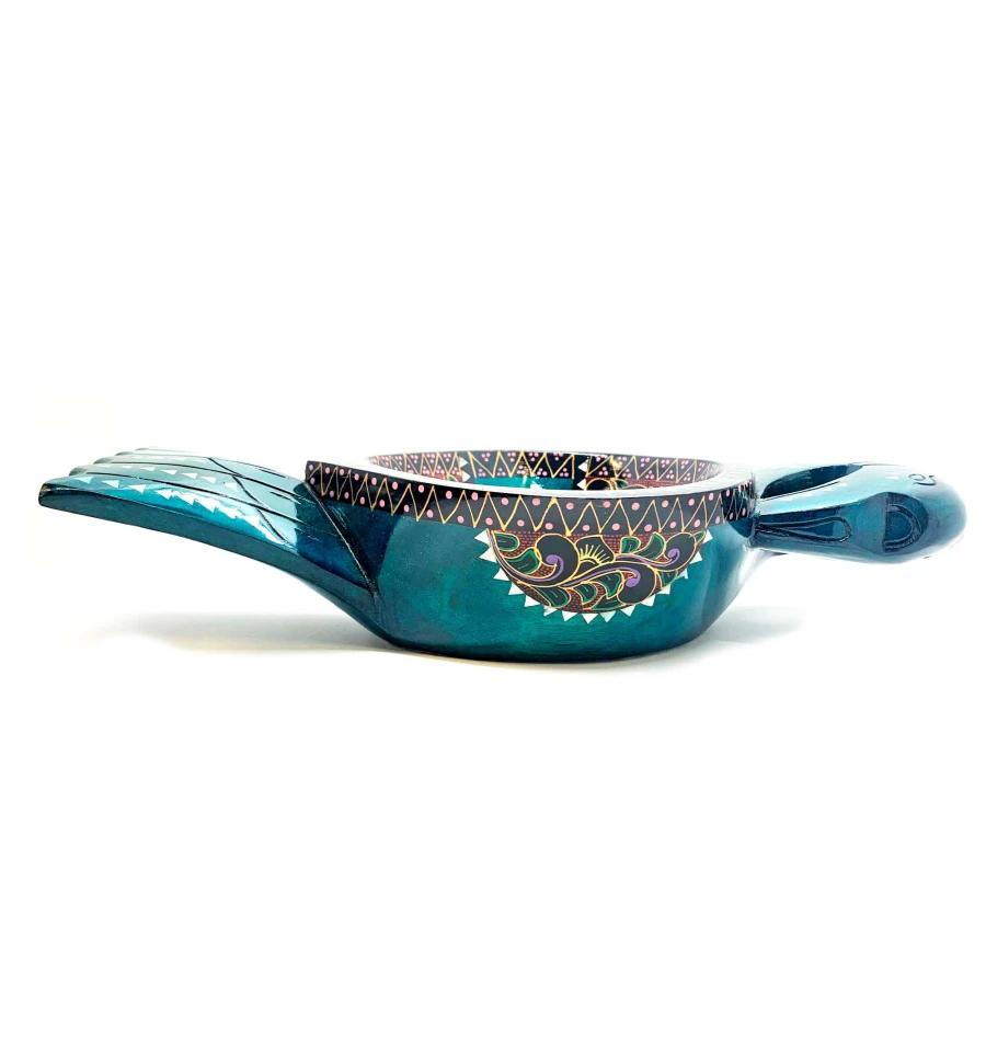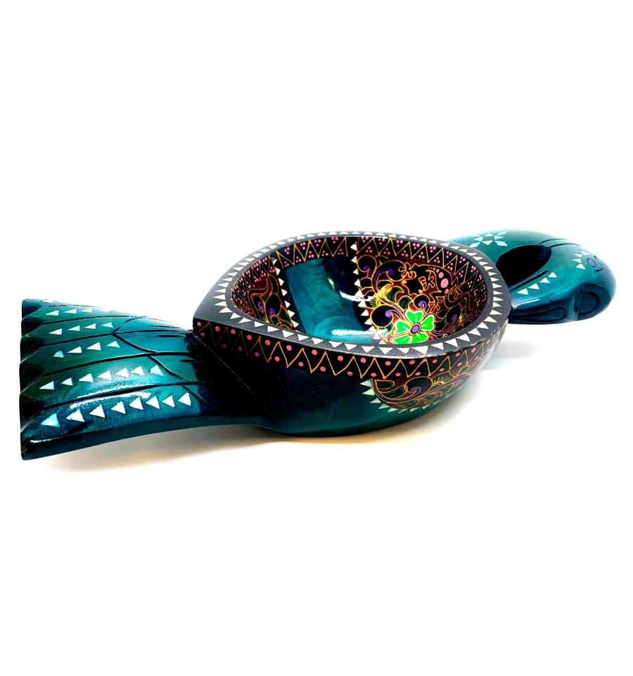 Блюдо выполнено в виде птицы и имеет ярко-зеленый цвет. Размеры составляют 34х16х7 см, что позволяет разместить на нем большое количество фруктов или других лакомств. Инкрустация из перламутра добавляет изделию особую изысканность и элегантность.
