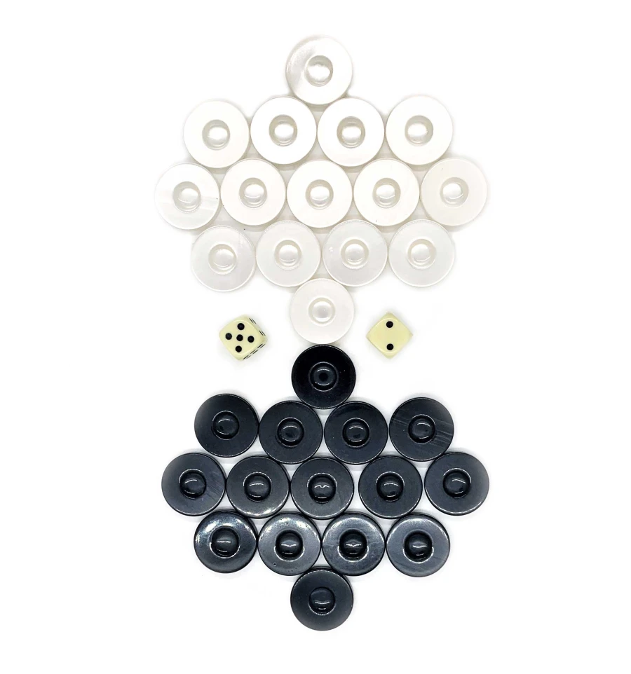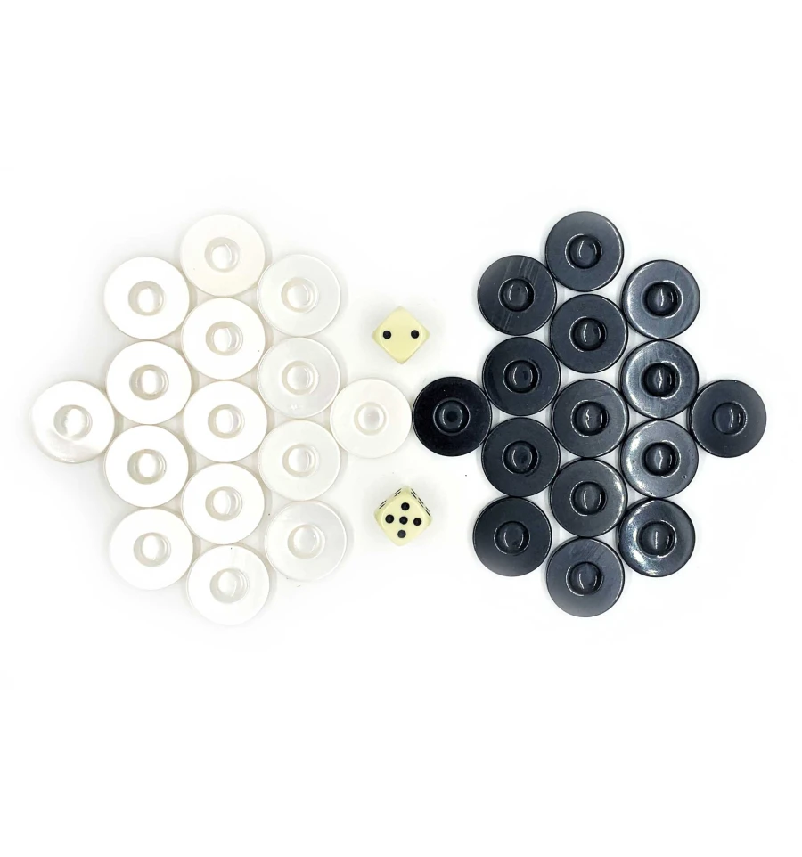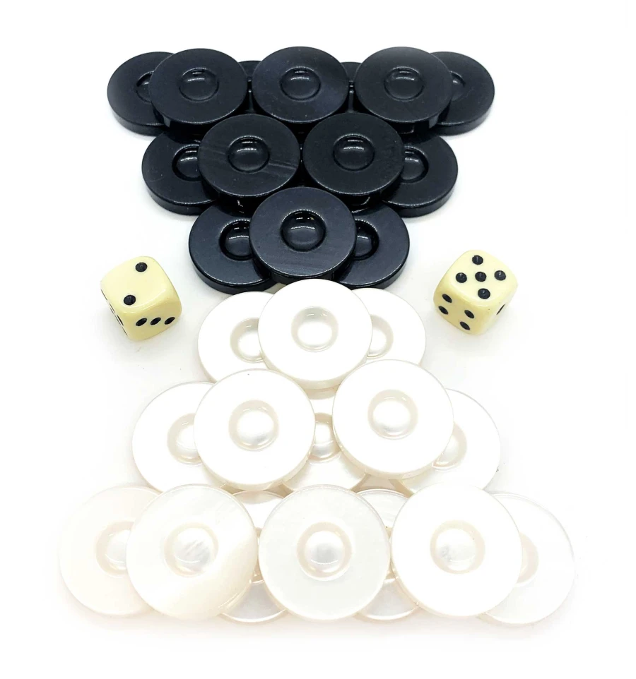 Представляем вам комплект фишек и кубиков для игры в нарды, выполненный под перламутр, что придает фишкам элегантный внешний вид. Каждая фишка имеет диаметр 30 мм, что делает их удобными для игры и хорошо видными на игровой поверхности.