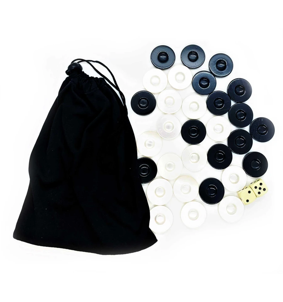 Комплект включает в себя 30 фишек и два кубика, а также мешочек для хранения, который позволит вам сохранить фишки и кубики в безопасности и легко переносить комплект.