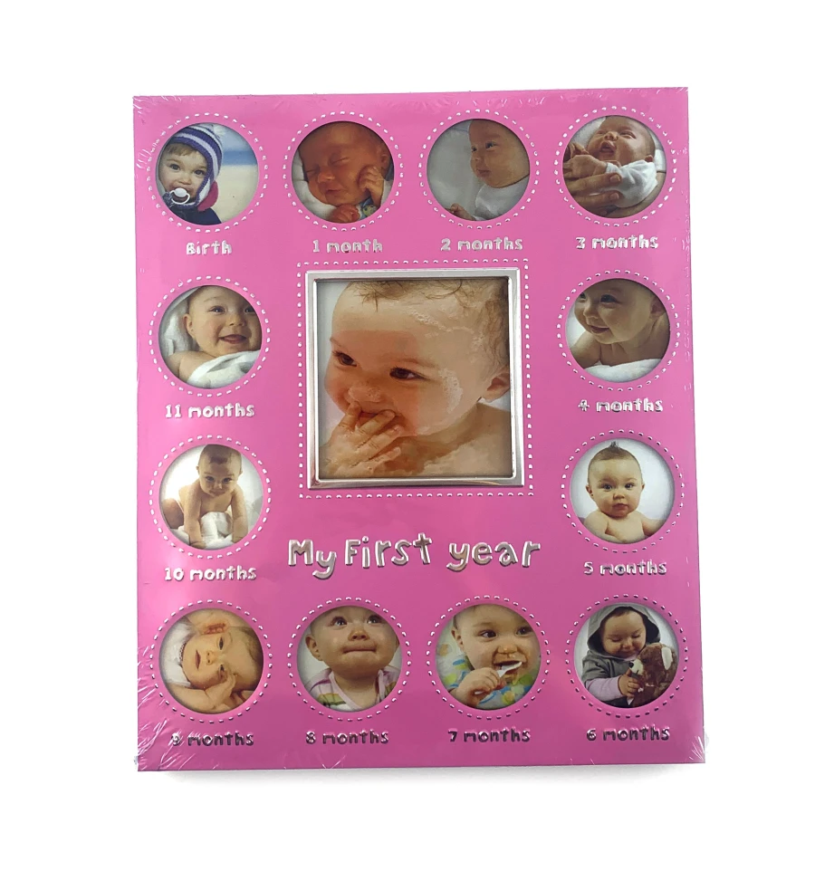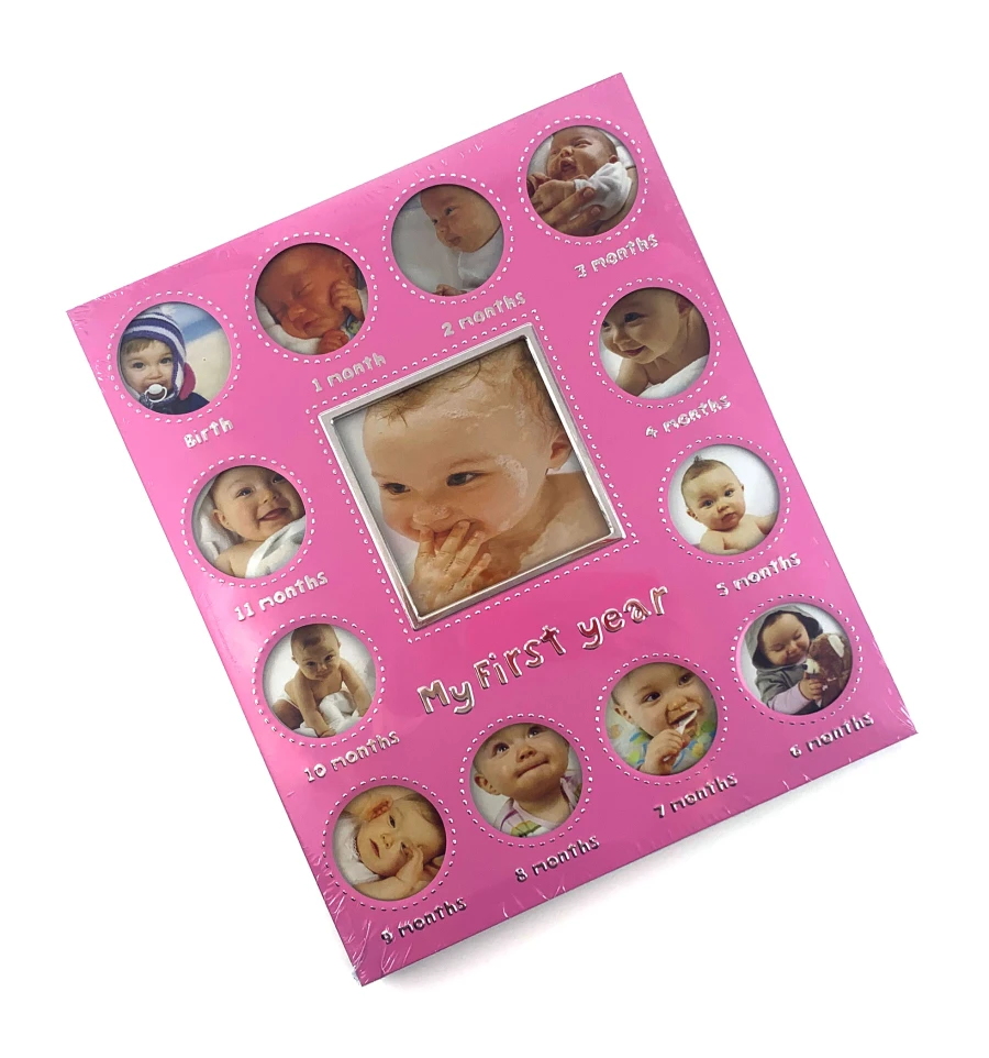 Фоторамка имеет размер 300х250х10 мм и выполнена в нежном розовом цвете, который придает ей неповторимую изящность и нежность. Внутри фоторамки расположены 13 мест под фотографии: 12 диаметром 45 мм и одно центральное место размером 90х85 мм. Здесь вы сможете разместить самые яркие и милые снимки вашего малыша, начиная с первых дней его жизни и до года.