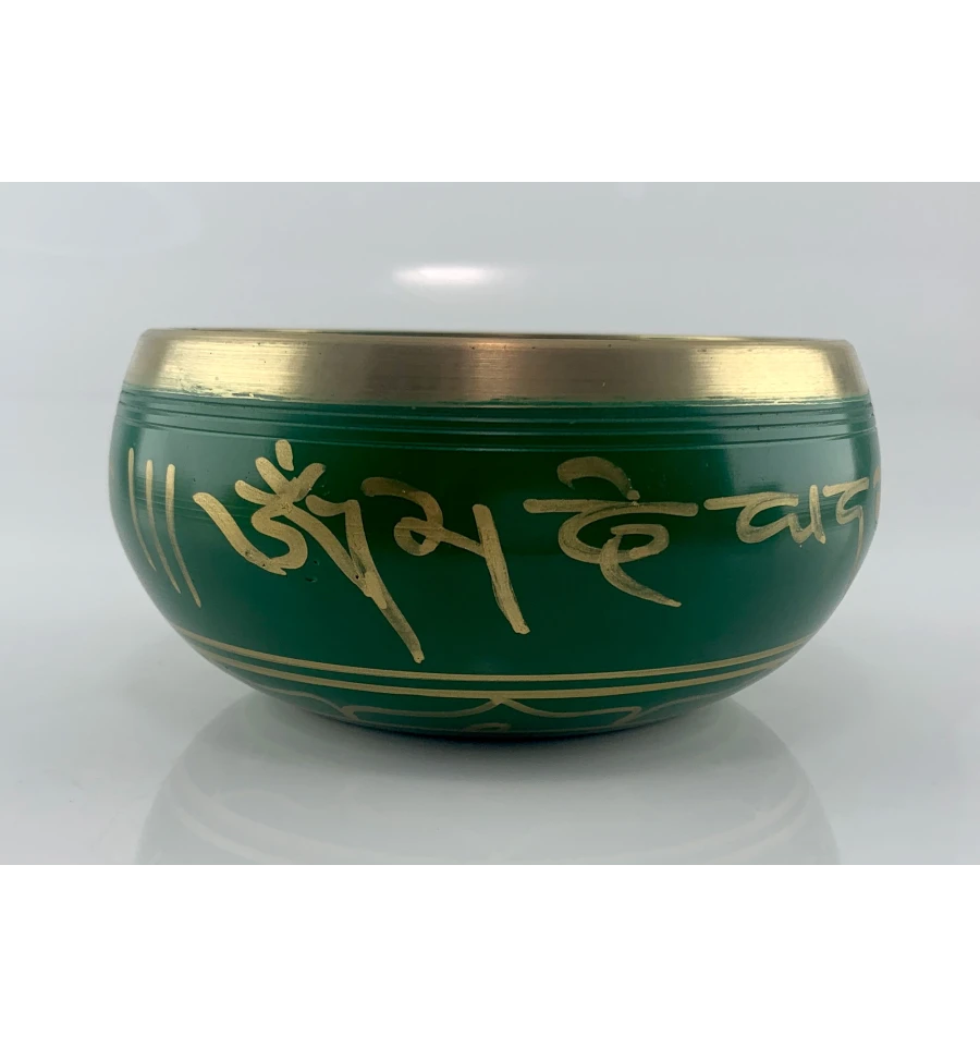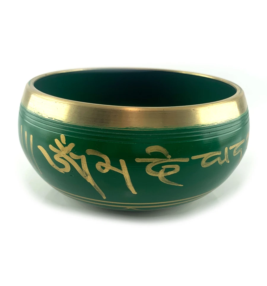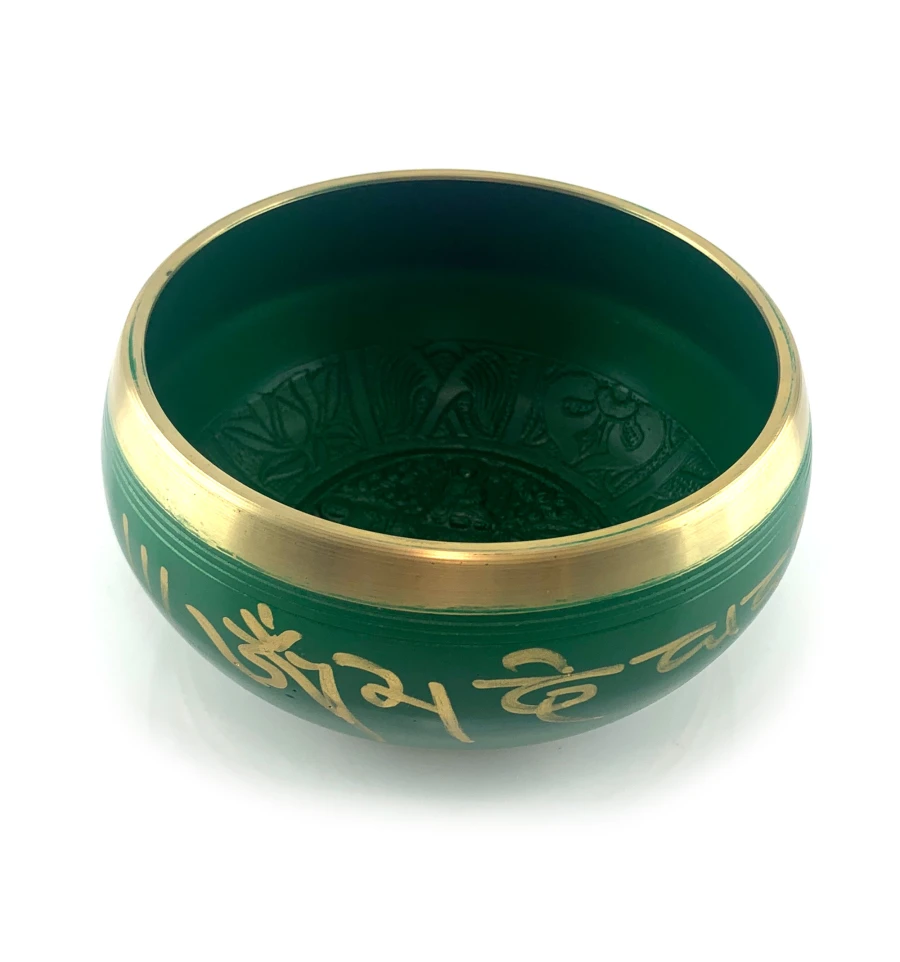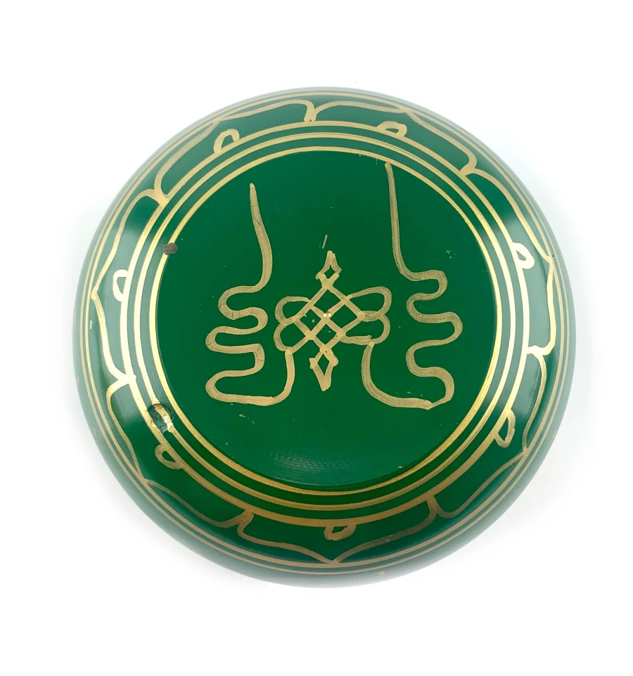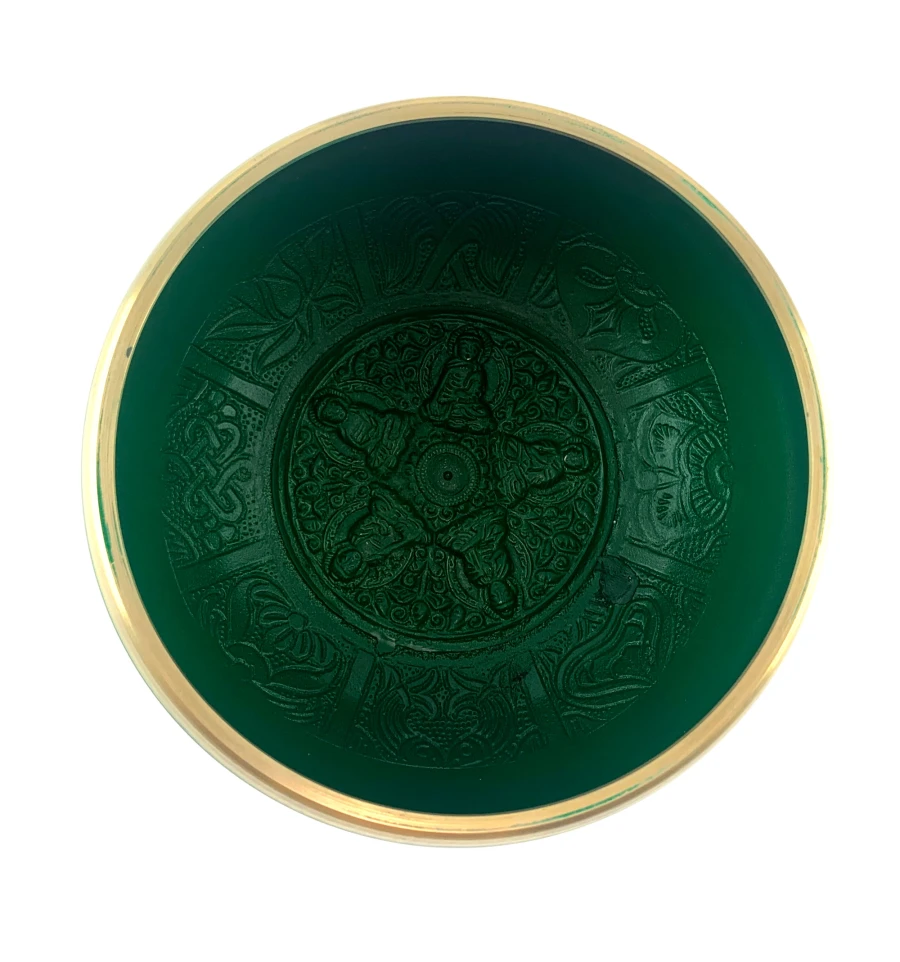 Поющая чаша в зеленом цвете, украшена изображениями пяти Будд и древними индийскими надписями. Эта чаша - это не просто музыкальный инструмент, это источник внутреннего покоя и духовного вдохновения.