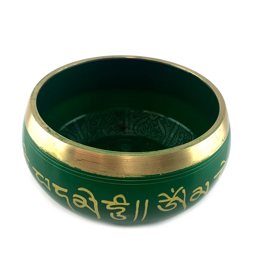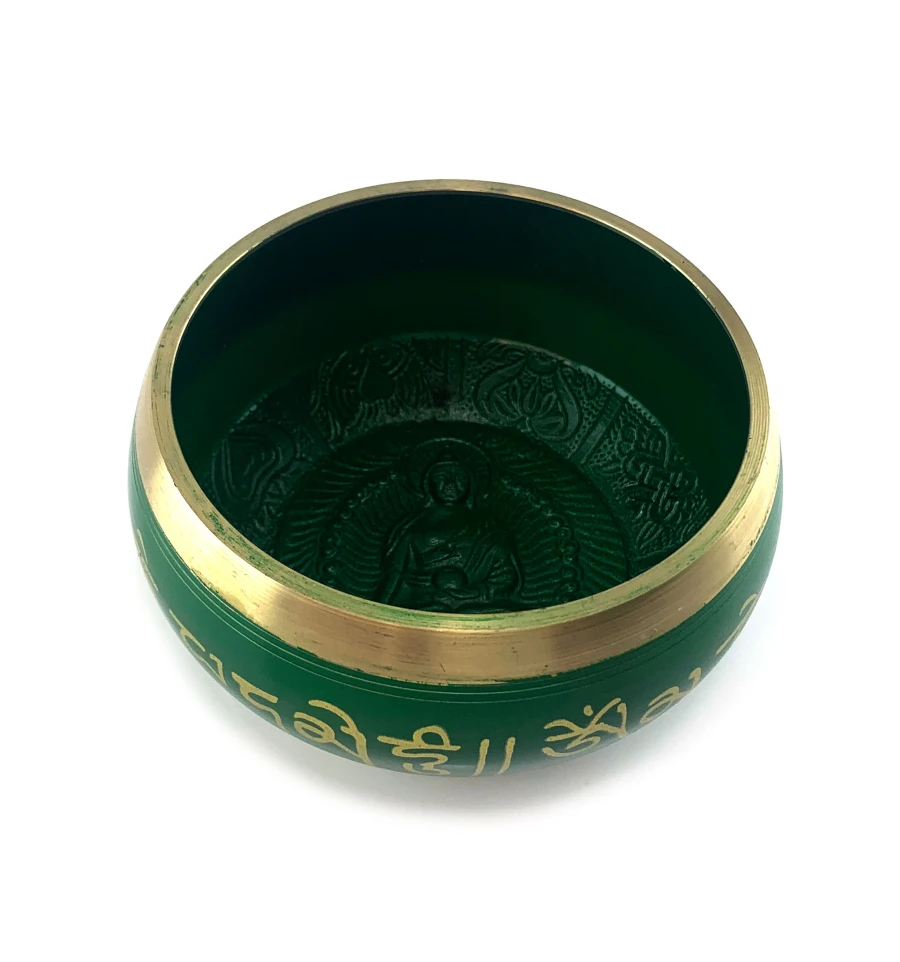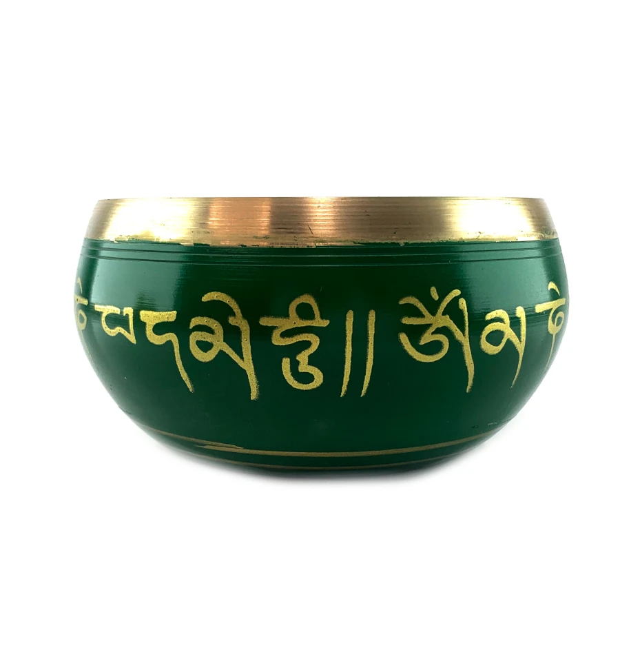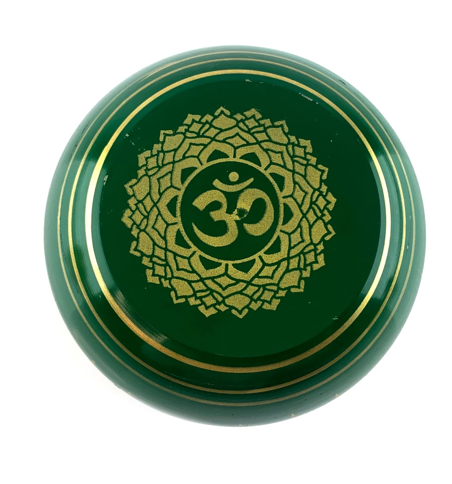 Чаша изготовлена из бронзы и окрашена в умиротворяющем зеленом цвете. Индийские надписи добавляют ей загадочности и таинственности. Внутри чаши изображен Будда, символ внутреннего покоя и просветления. На дне снаружи украшение в виде знака "ОМ" придает чаше особый символический смысл.