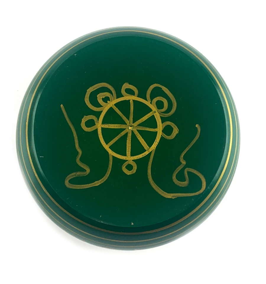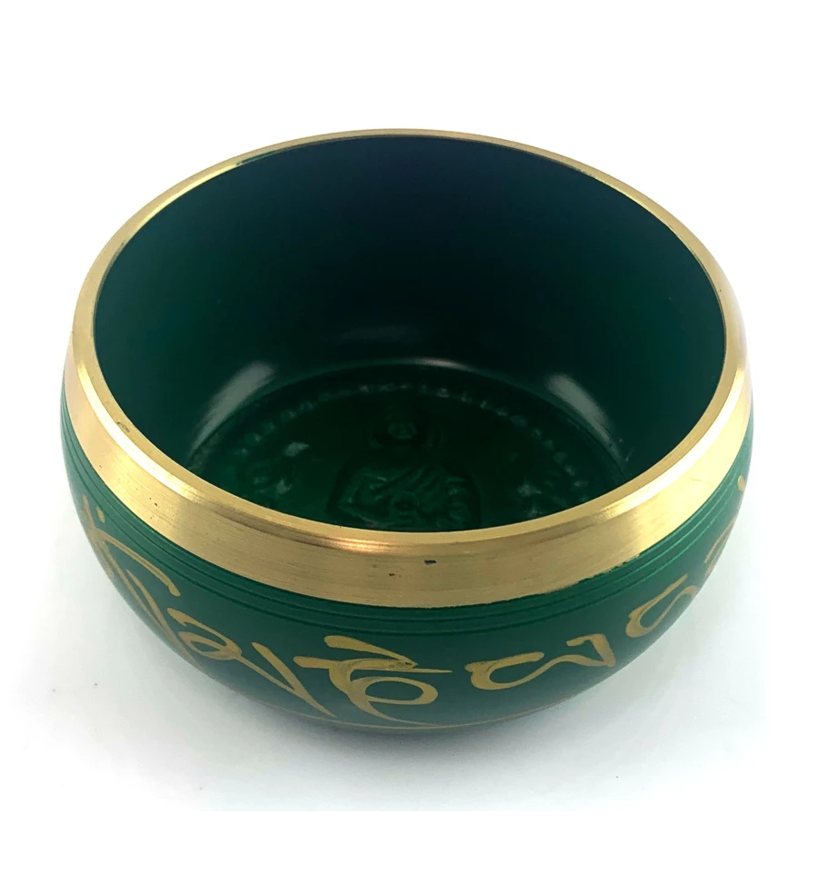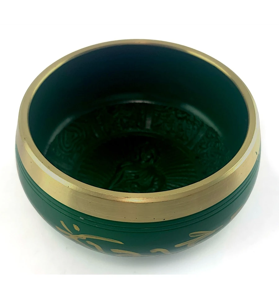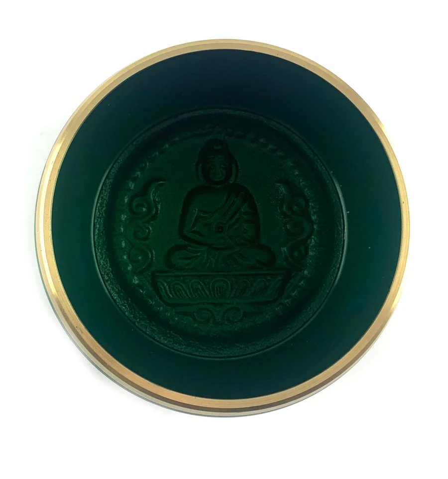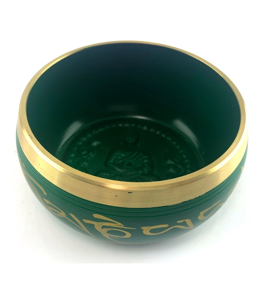Поющая чашей в зеленом цвете, украшена изображением пяти Будд и индийскими мудрыми надписями. Эта чаша - не просто музыкальный инструмент, это произведение искусства, наполненное духовной силой и величием.