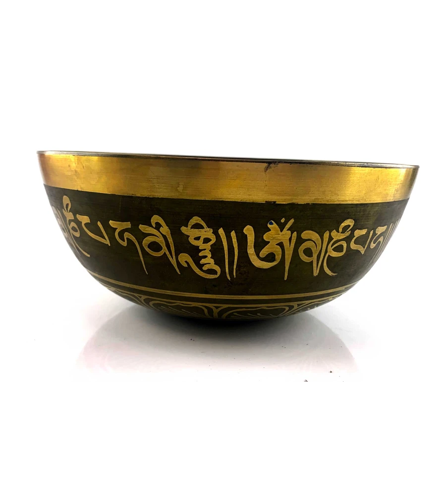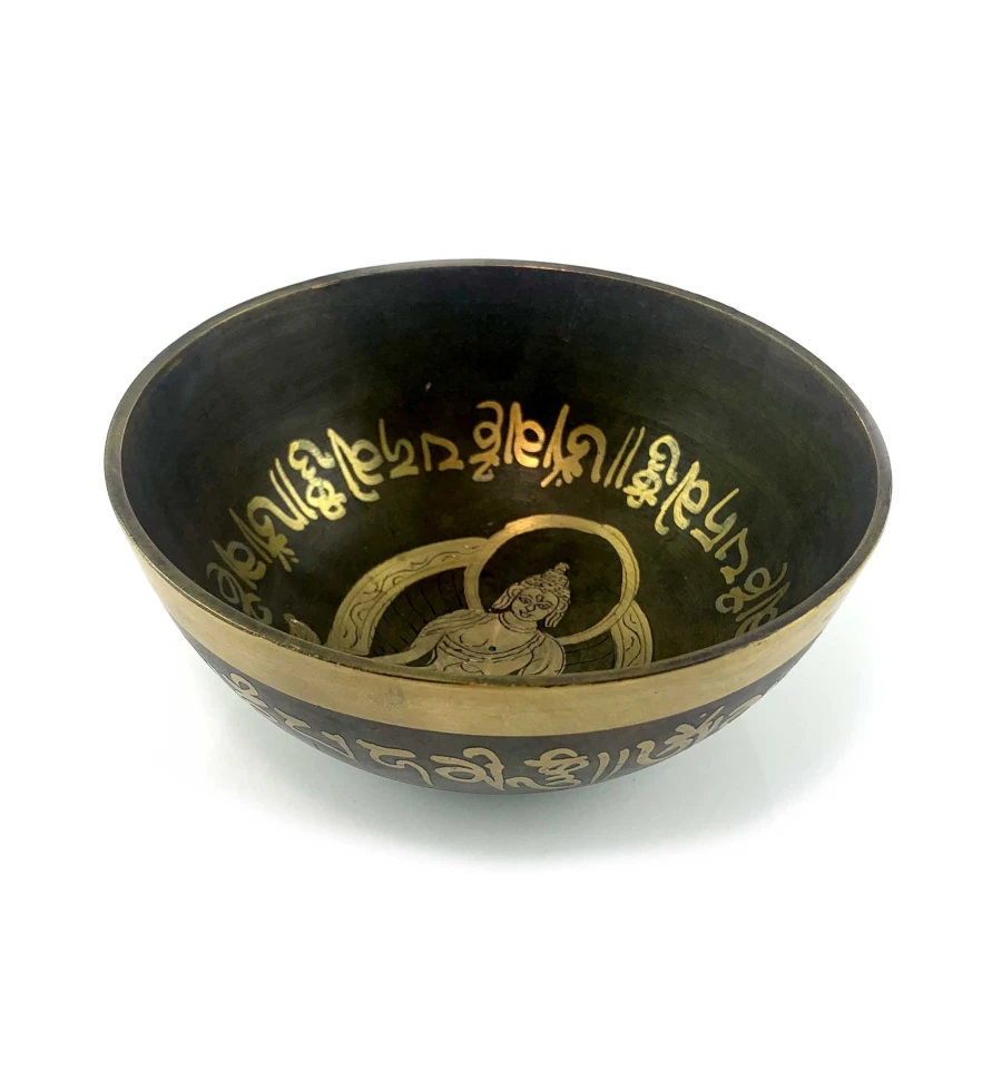 Представляем вам уникальную поющую чашу в темно-оливковом цвете, украшенную изображением Будды и таинственными надписями на Санскрите, выполненными золотистым цветом. Эта чаша представляет собой великолепный образец древних ремесел и духовной глубины.
