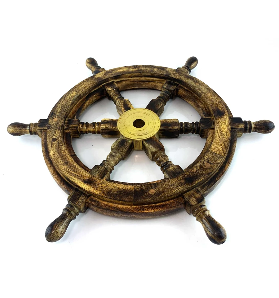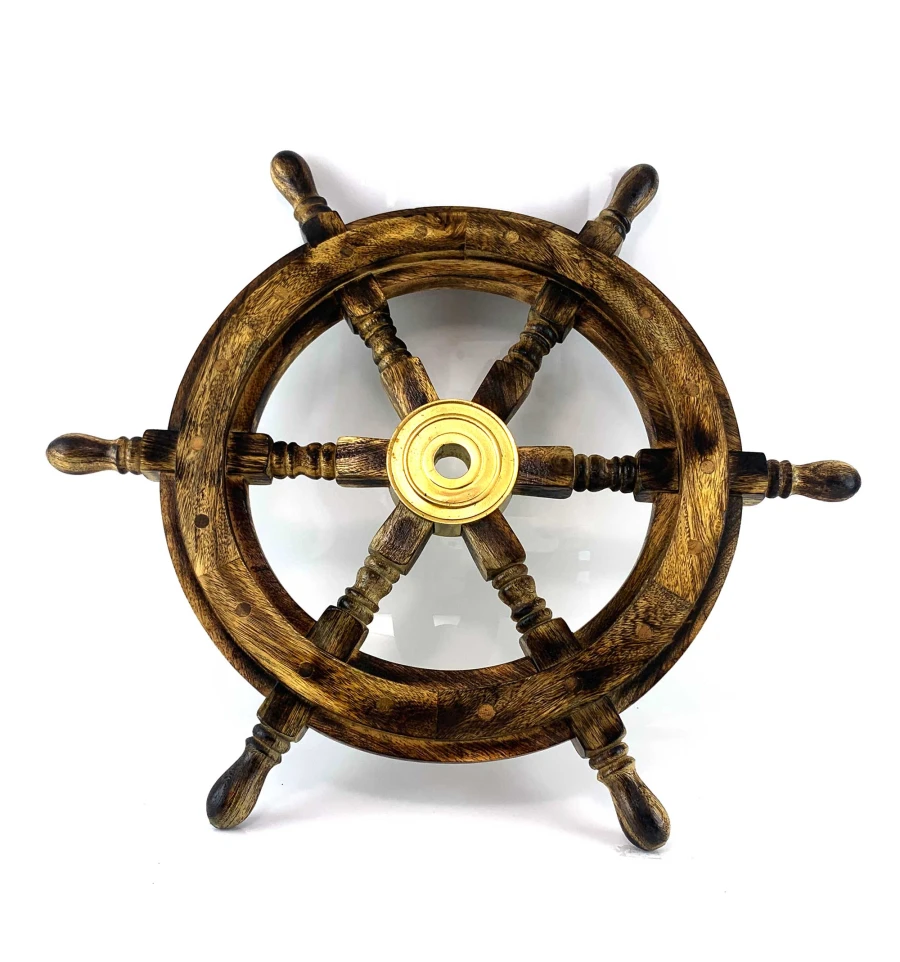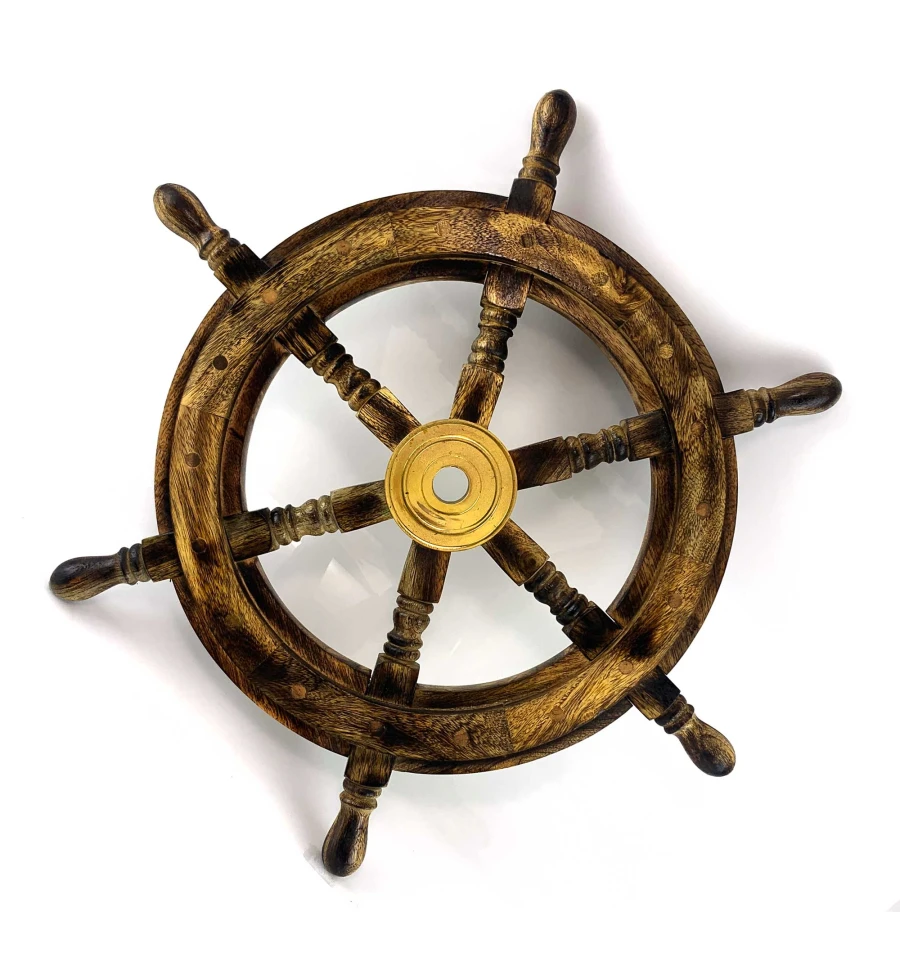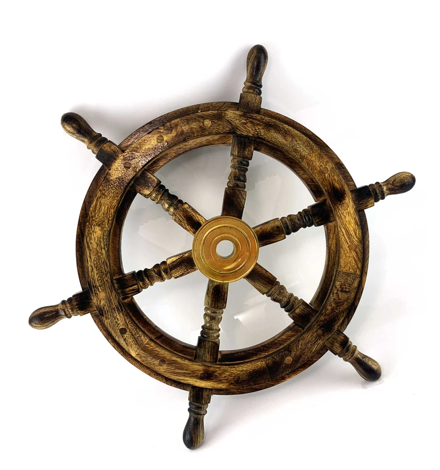Декор на стену в виде штурвала - это изящное и стильное украшение, которое добавляет особого шарма и морского настроения к вашему интерьеру. Этот штурвал изготовлен из натурального дерева с бронзовым диском в центре штурвала.