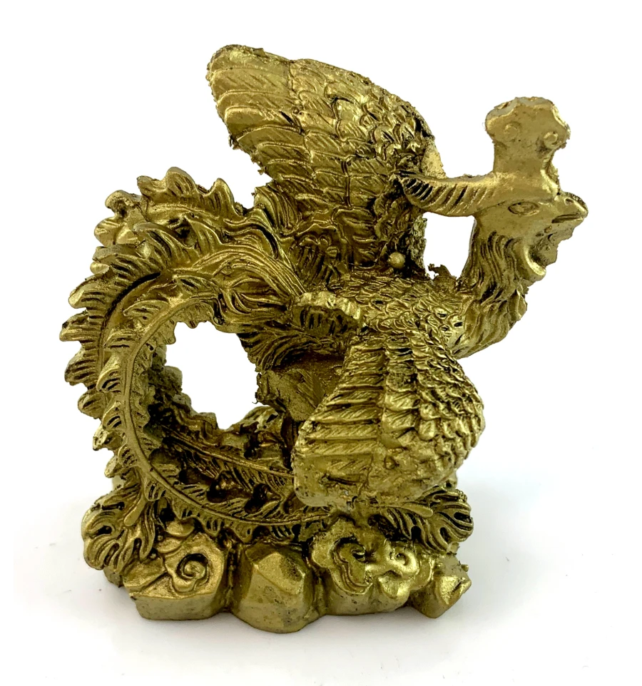 Дракон, своей грозной стойкой фигурой, дополняет грациозность Феникса, который взлетает к новым высотам. Бронзовое покрытие добавляет блеск и визуальный интерес, создавая восхитительное сочетание текстур и цветов.