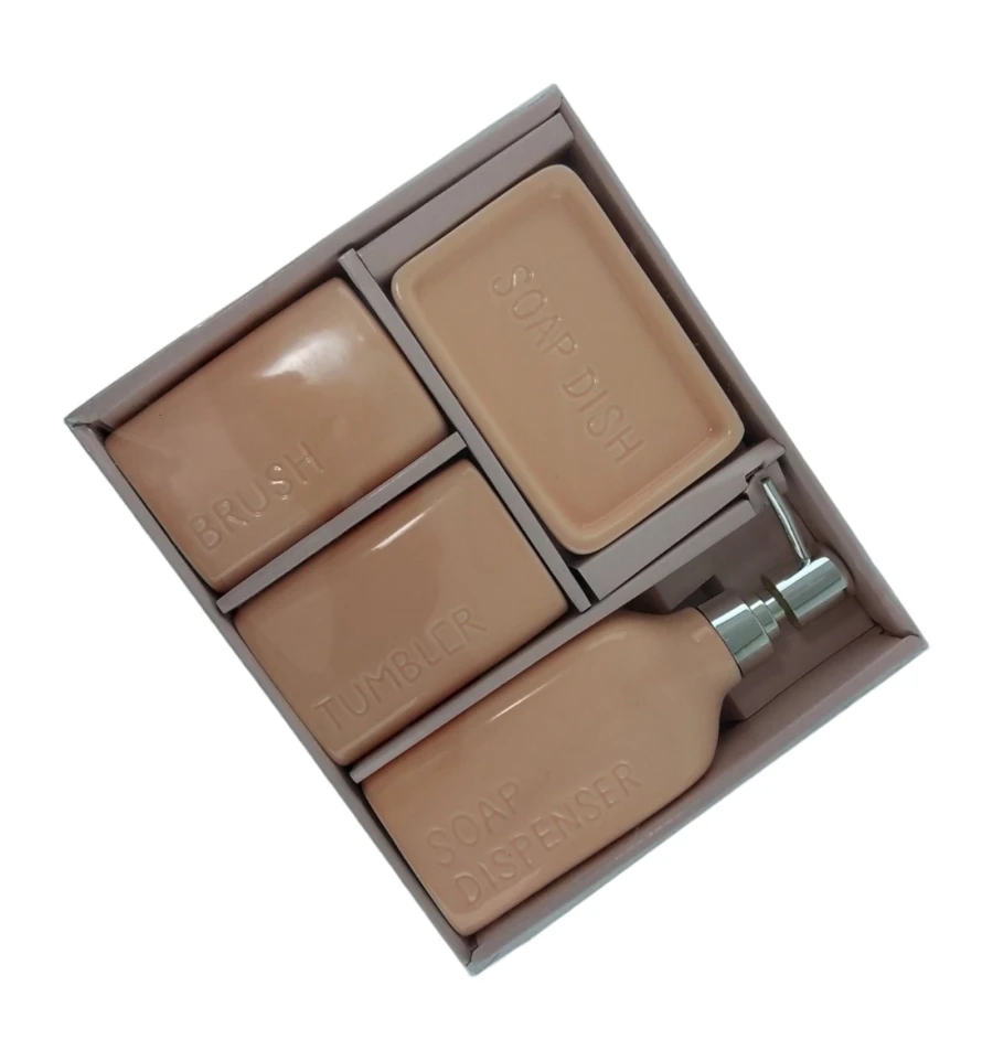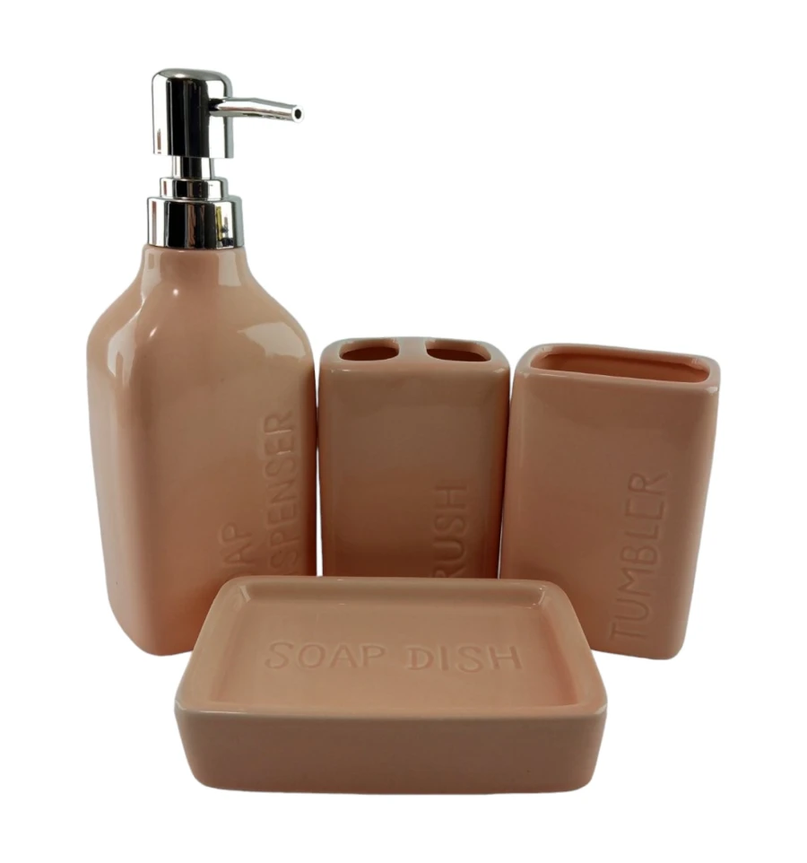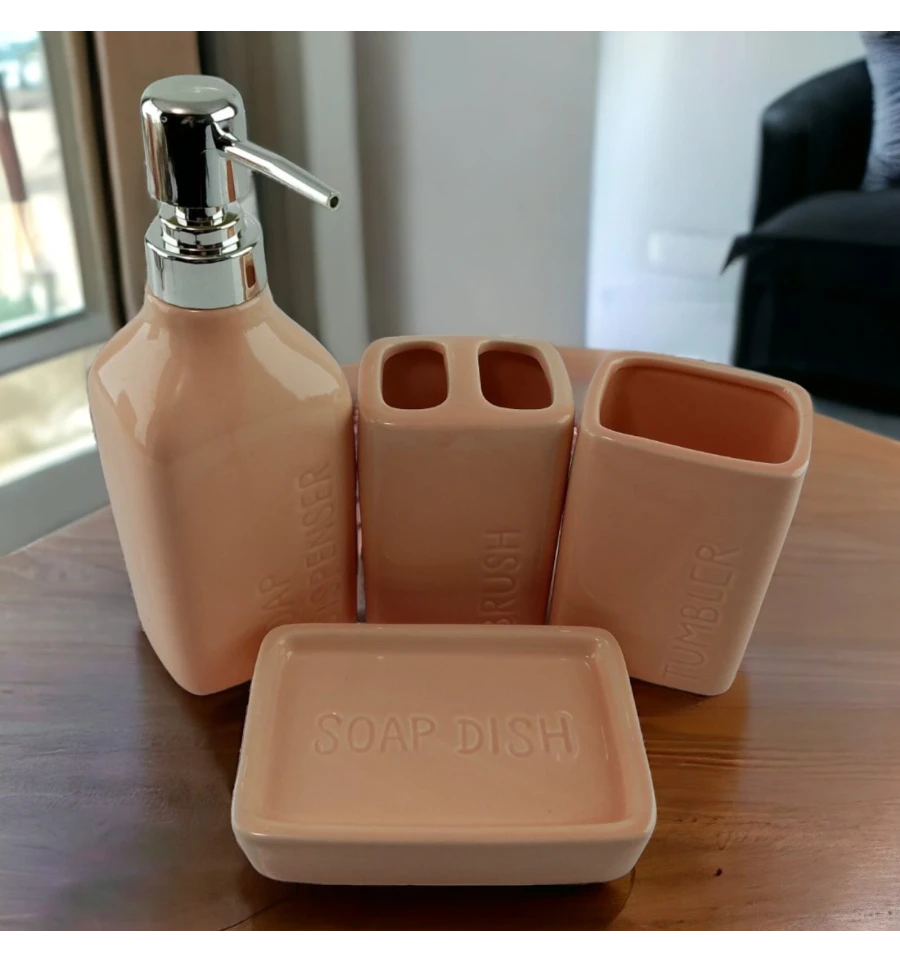С очаровательным набором аксессуаров для ванной все предметы будут на своих местах. В керамический набор входит-дозатор для жидкого мыла, стакан ,органайзер для зубных щеток, мыльница.