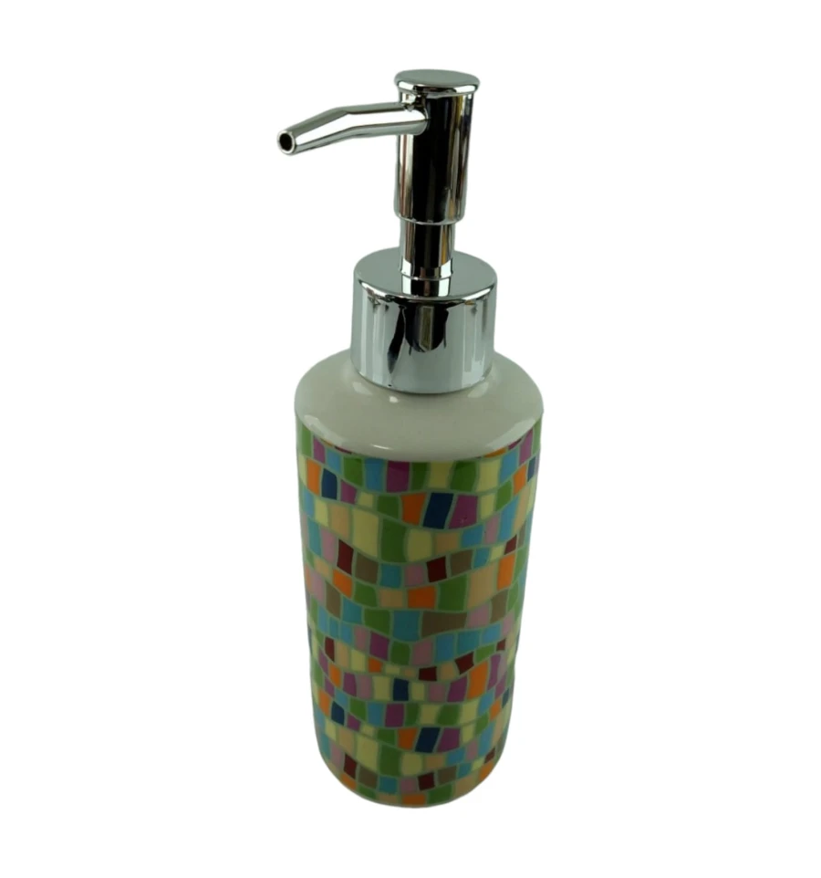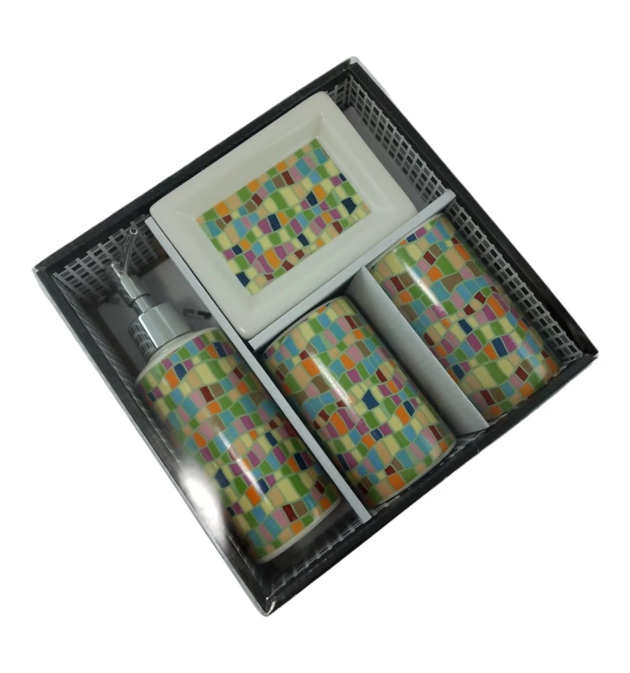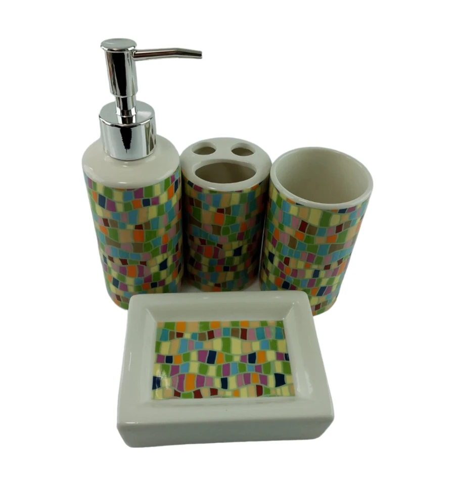 С очаровательным набором аксессуаров для ванной все предметы будут на своих местах. В керамический набор входит-дозатор для жидкого мыла, стакан ,органайзер для зубных щеток, мыльница.