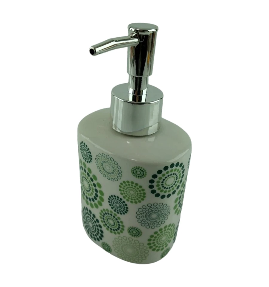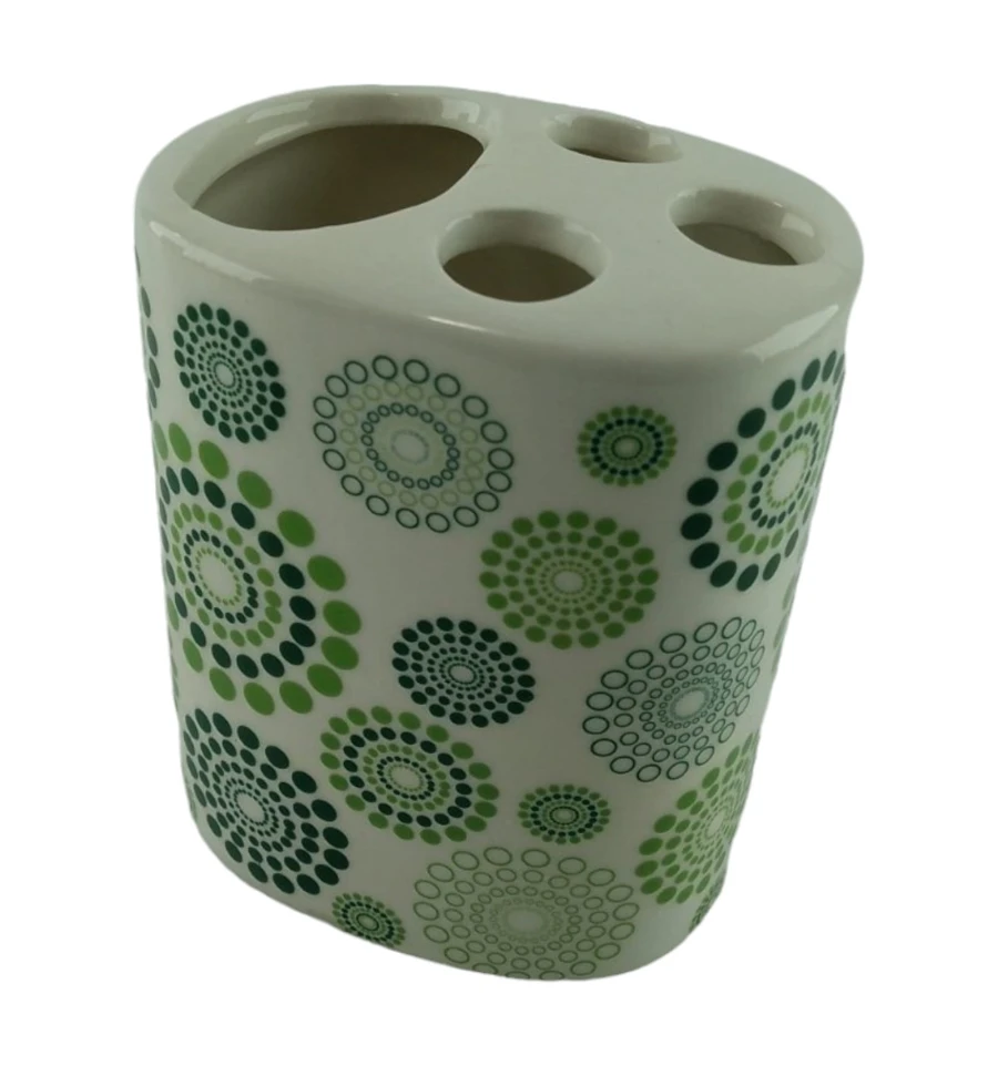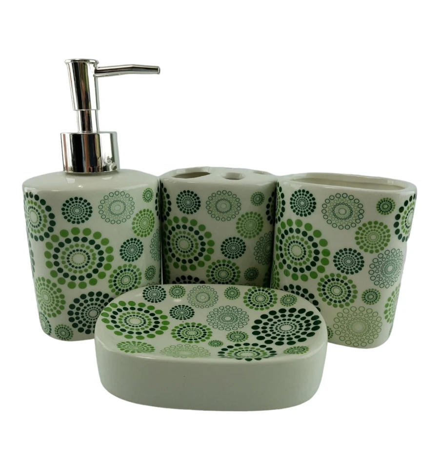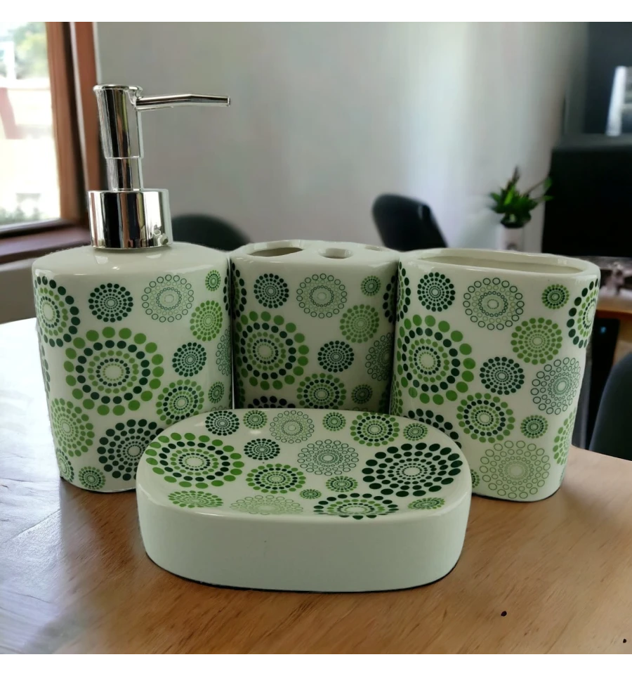С очаровательным набором аксессуаров для ванной все предметы будут на своих местах. В керамический набор входит-дозатор для жидкого мыла, стакан ,органайзер для зубных щеток, мыльница.