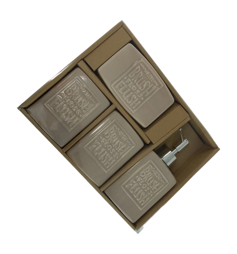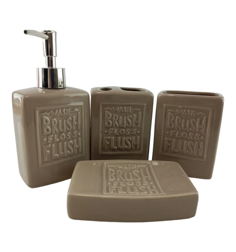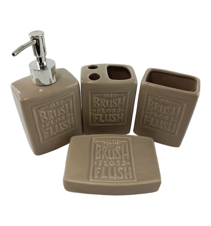 С очаровательным набором аксессуаров для ванной все предметы будут на своих местах. В керамический набор входит-дозатор для жидкого мыла, стакан ,органайзер для зубных щеток, мыльница.